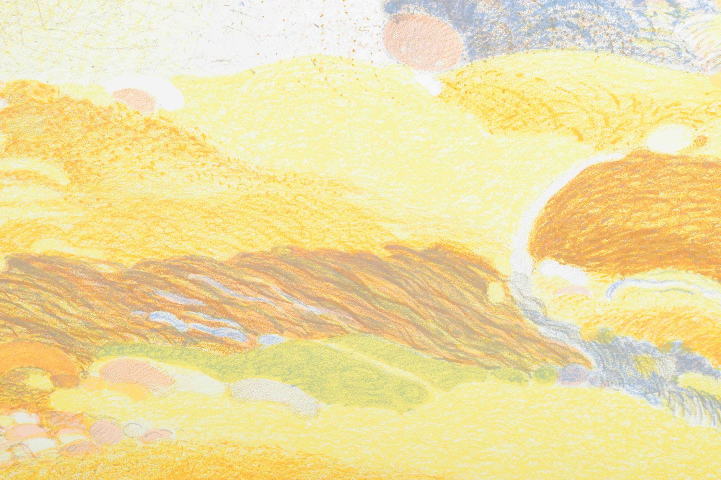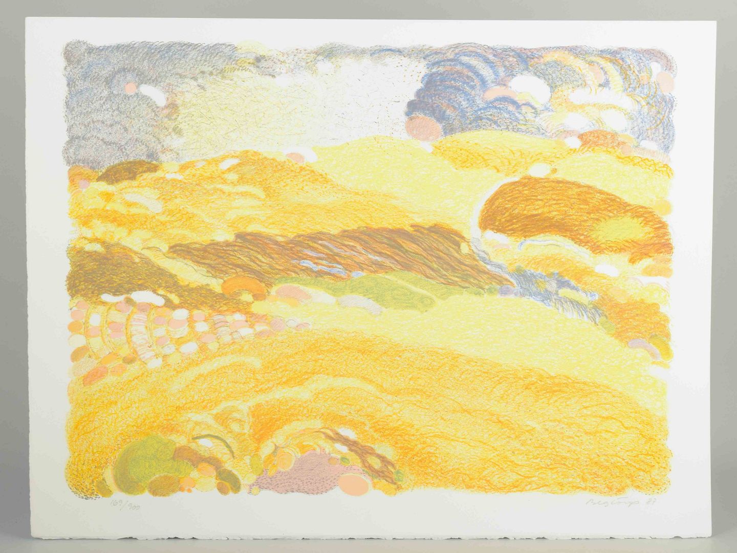 Abstrakt farvelitografi med organiske og bølgende former i gule og gyldne nuancer, der danner et stemningsfuldt landskab.