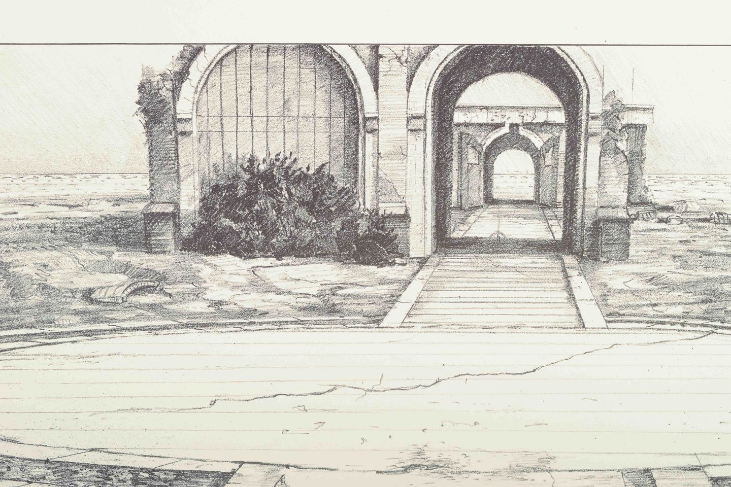 Et detaljeret og stemningsfuldt værk med et arkitektonisk motiv, hvor buede porte og forfaldne stier fører blikket ind i dybden. De fine stregtegninger skaber en næsten drømmeagtig atmosfære, der balancerer mellem virkelighed og fantasi.