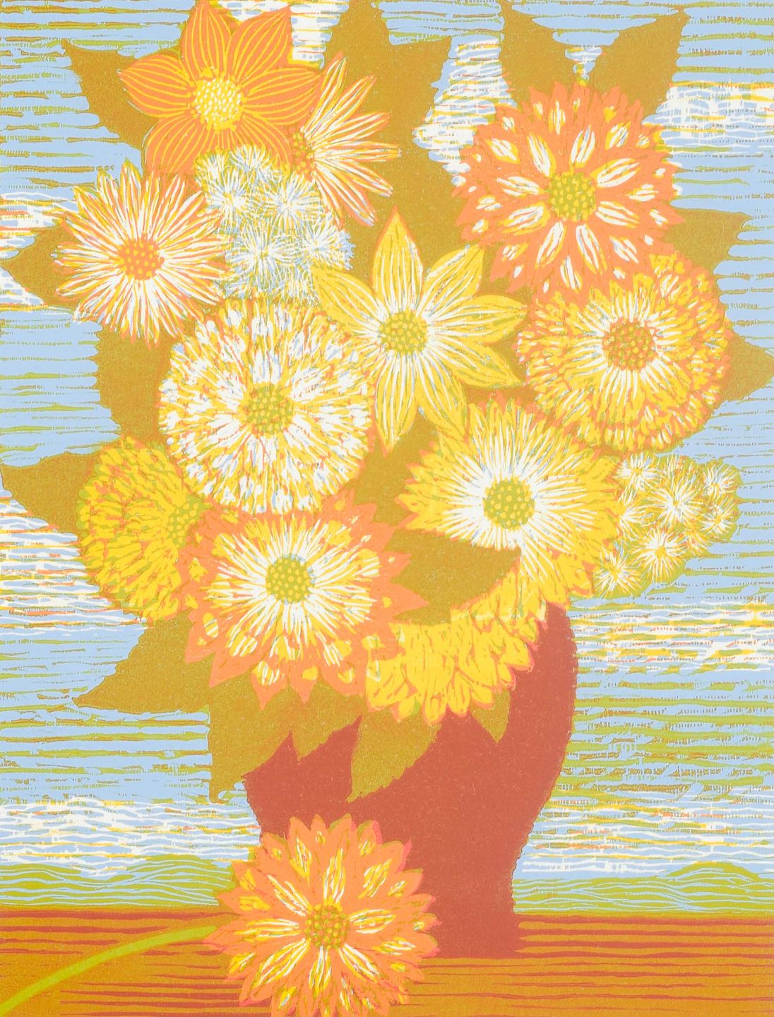 Et dekorativt og farverigt motiv med en buket blomster i vase. Kompositionen er præget af varme gule og orange nuancer, der giver værket en livlig og solrig stemning. Den grafiske enkelhed og klare farveflader fremhæver motivets dekorative karakter og skaber et harmonisk udtryk.