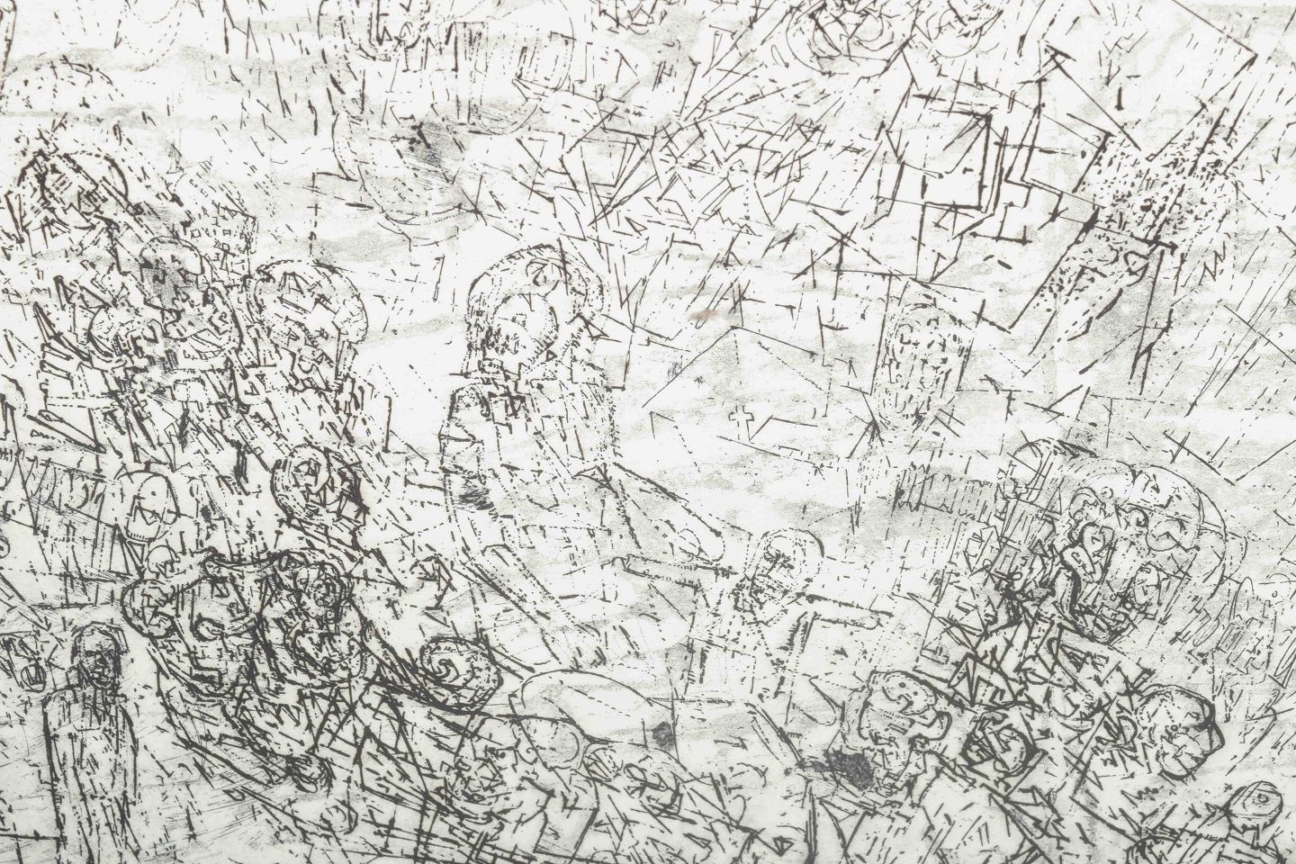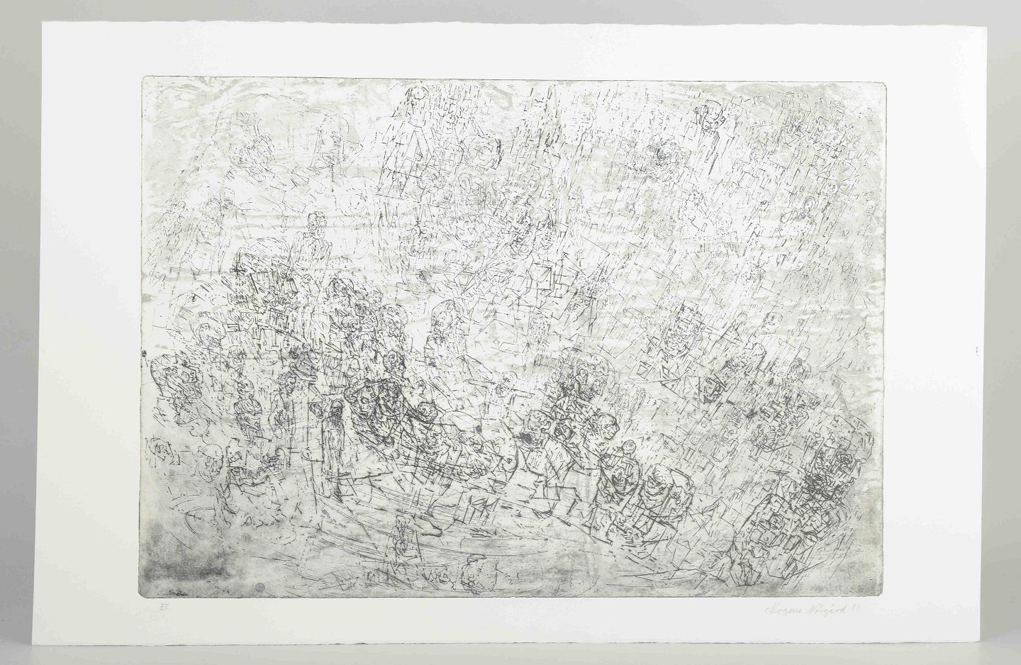Et grafisk værk udført som radering med fine og komplekse linjer, hvor motivet fremstår næsten abstrakt med antydninger af figurer og bevægelser. Værket demonstrerer Nørgårds sans for at indfange en stemning gennem et rytmisk spil af linjer og flader.