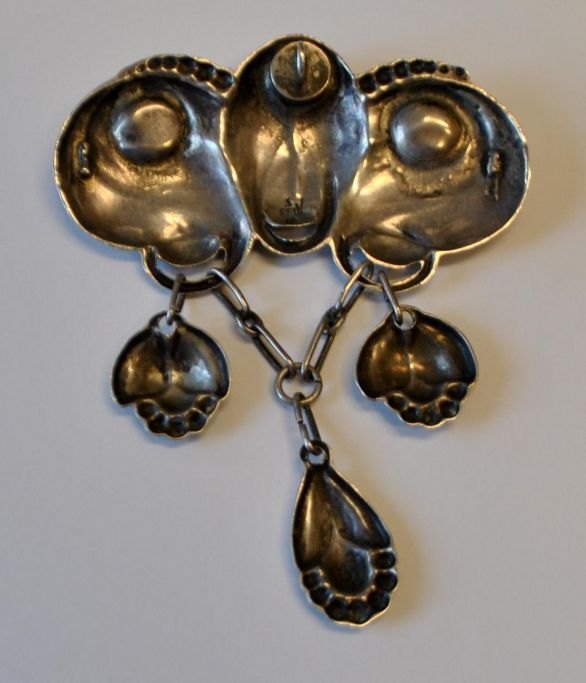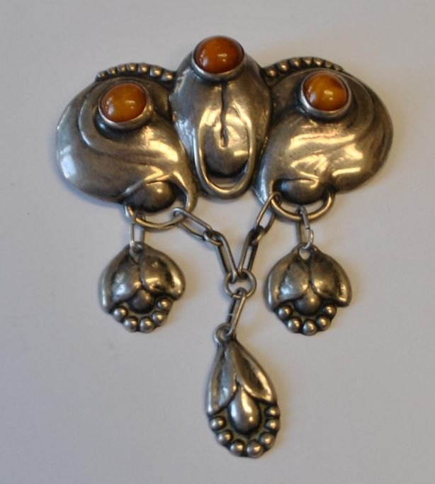 Dänischer Jugendstil-Anhänger aus Silber mit Bernstein, 20. Jahrhundert. Verzierung in Form von Blattwerk. Gestempelt 830 und undeutliche Meistermarke. B.: 7 cm. H.: 9 cm.Das Schmuckstück ist zum Aufhängen an einer Kette gedacht. Auf der Rückseite befand sich ursprünglich eine Nadel, sodass es als Brosche verwendet werden konnte.