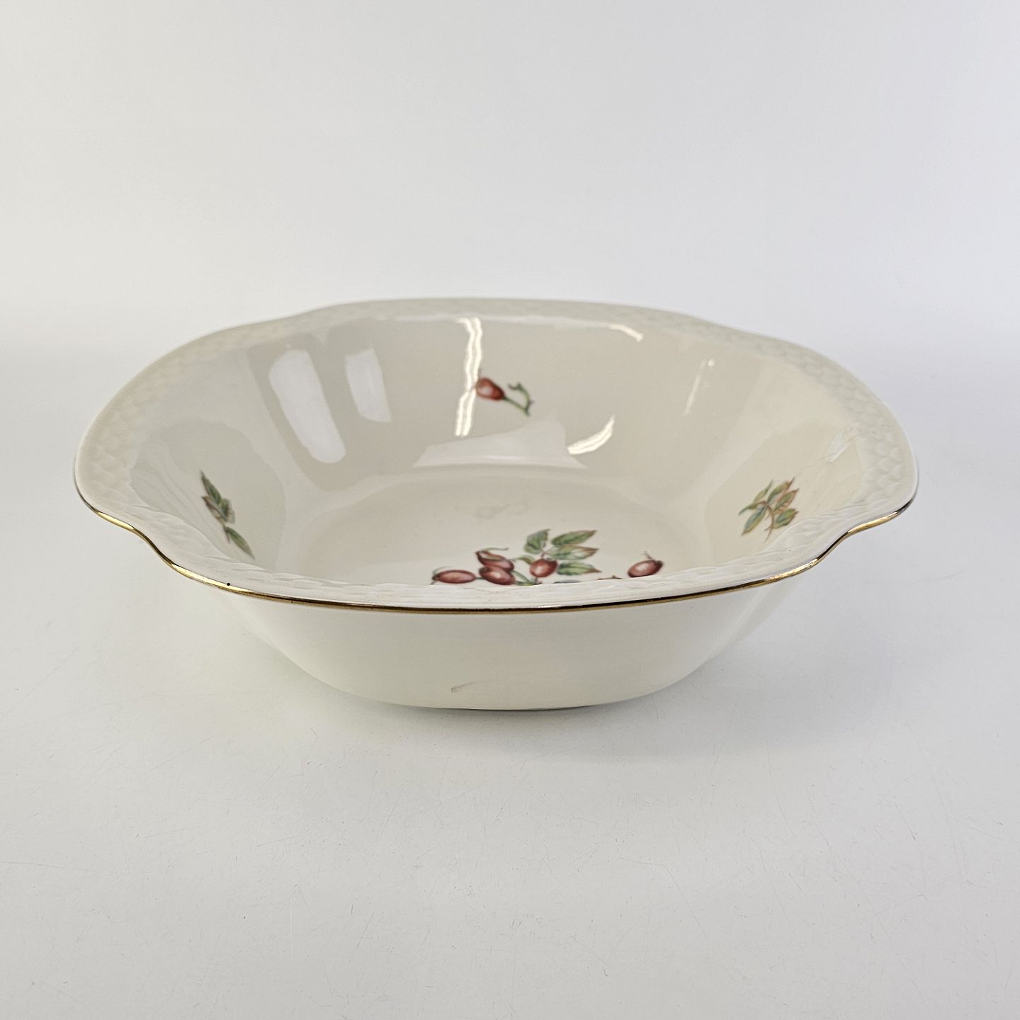 Balder er cremefarvet porcelæn i skælform, dekoreret med hyben og en guldkant.