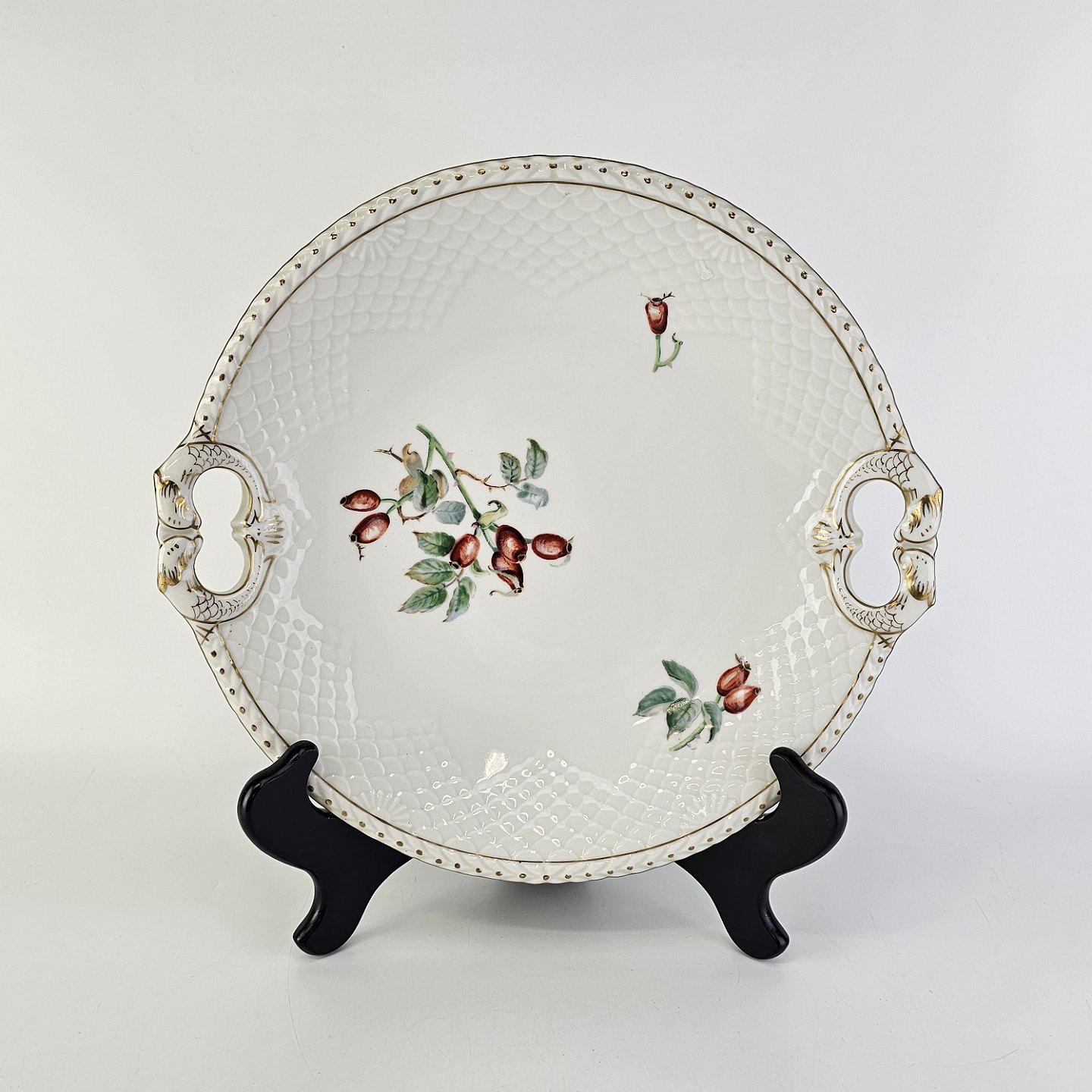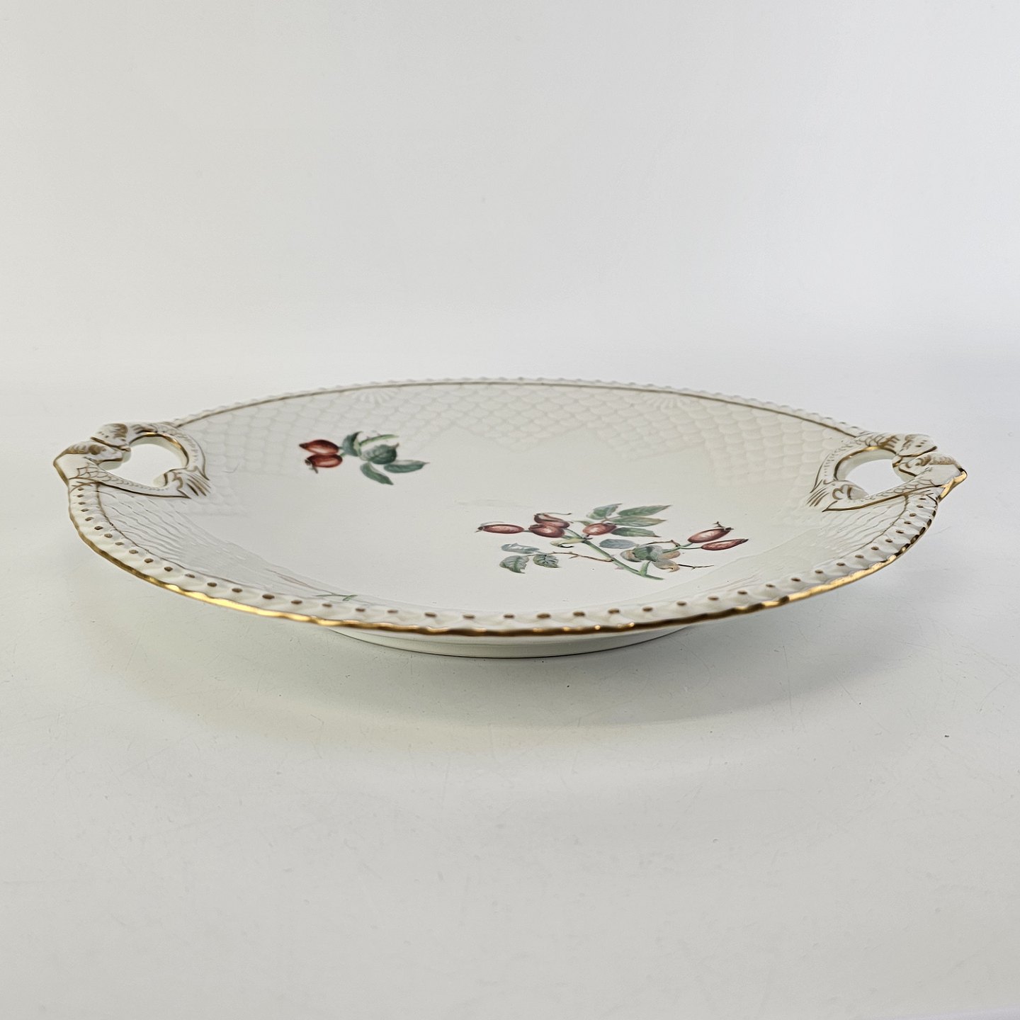 Balder er cremefarvet porcelæn i skælform, dekoreret med hyben og guldkant.