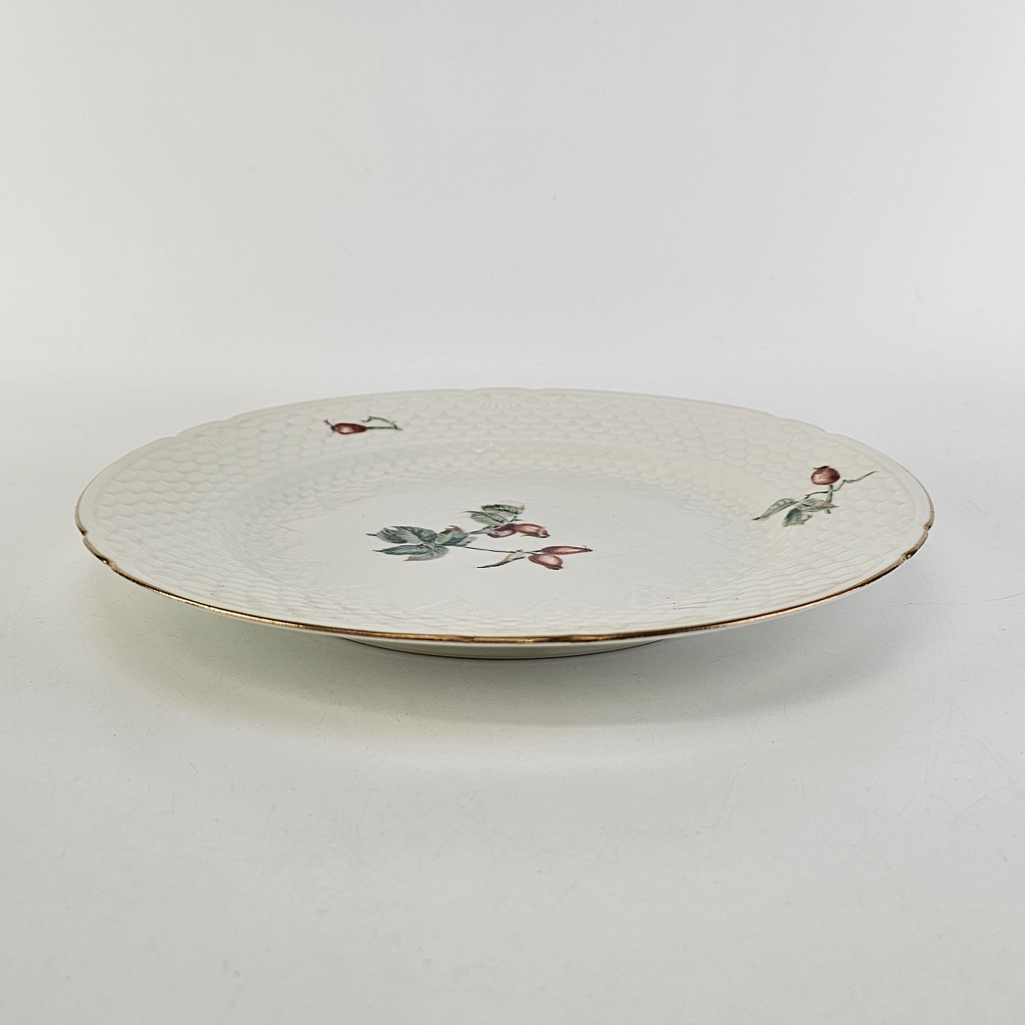 Balder er cremefarvet porcelæn i skælform, dekoreret med hyben og guldkant.