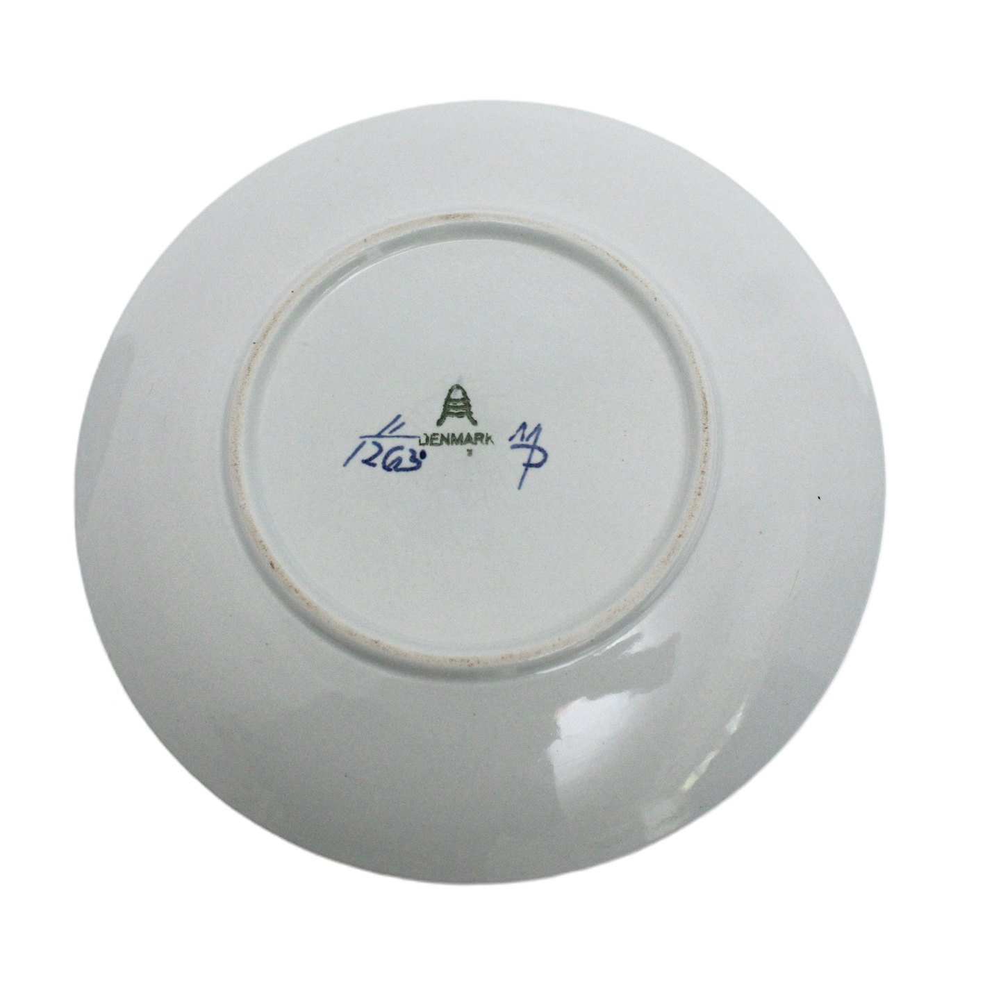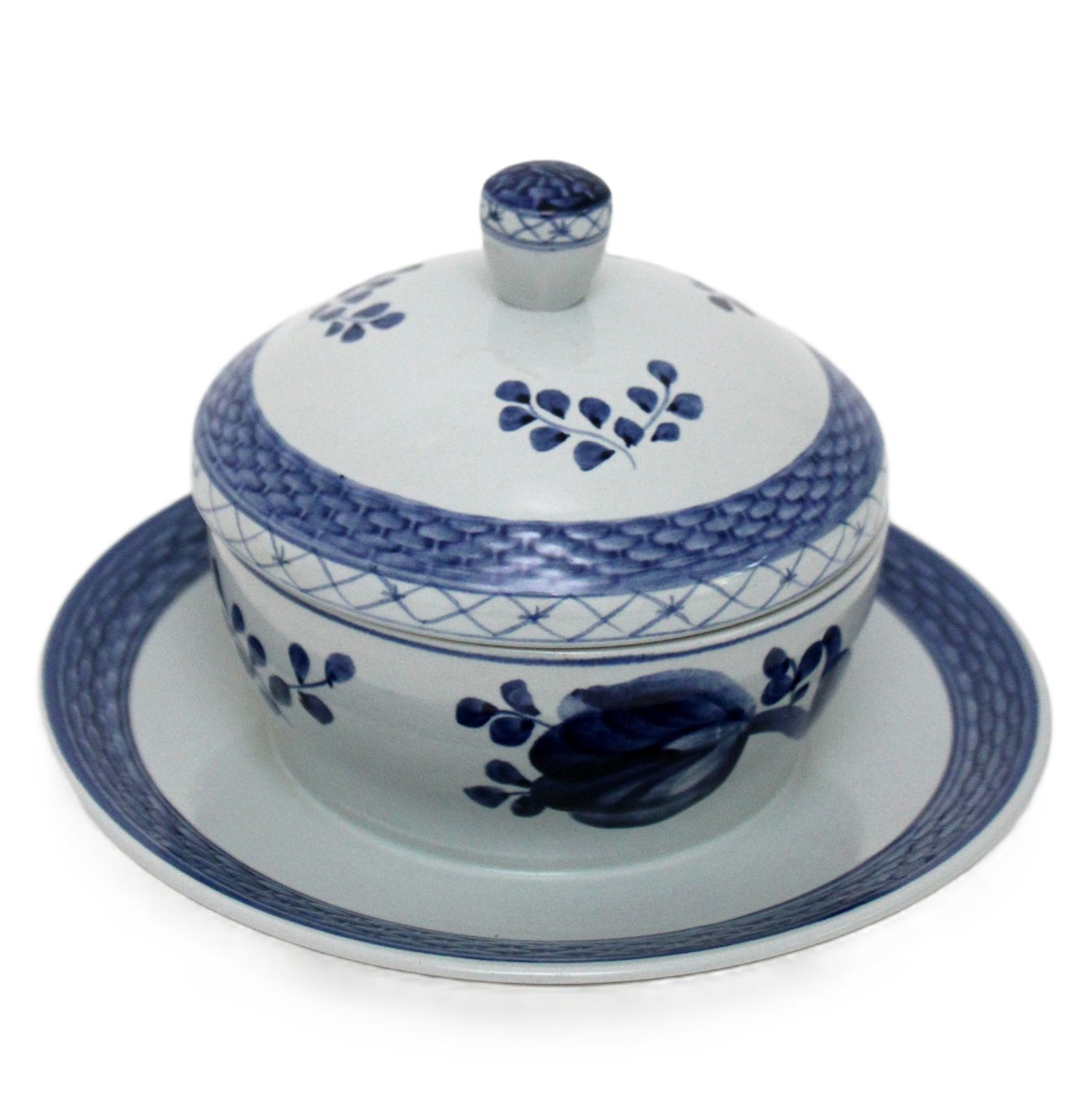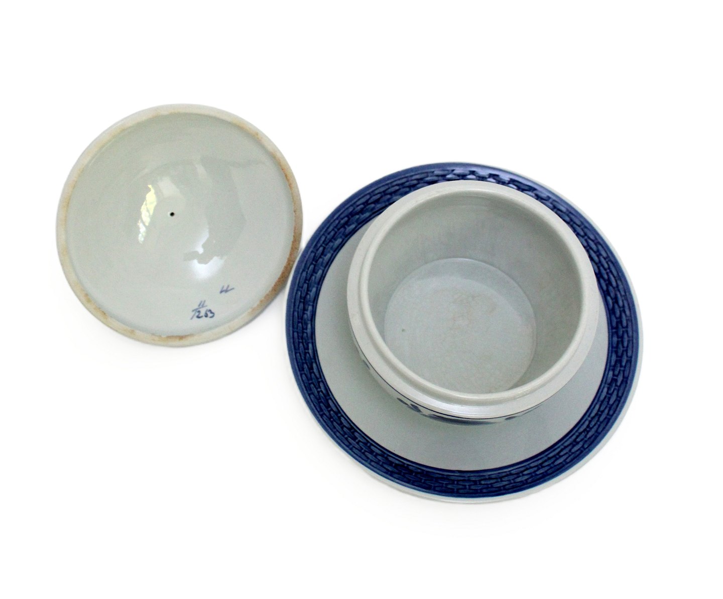Aluminia, Tranquebar lyseblå fajance med mørkeblå tulipan og flettet bort designet af Christian Joachim. Produceret fra 1914 til 1969 på Aluminiafabrikken, derefter overgik det til Royal Copenhagen.Smørskål med låg og fast underfad. Nr. 11/1263. Højde 11 cm. Diameter 11 cm. Underfad 16,5 cm. God stand med lettere misfarvet krakelering indvendig. Pris: 325 kr. stk. Lager: 1