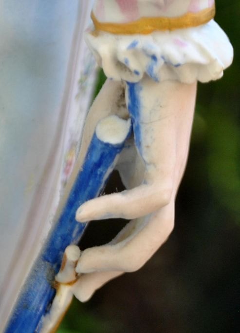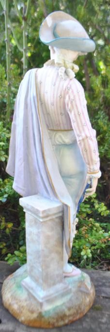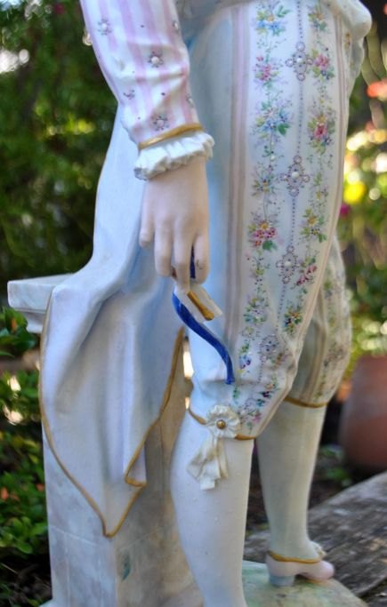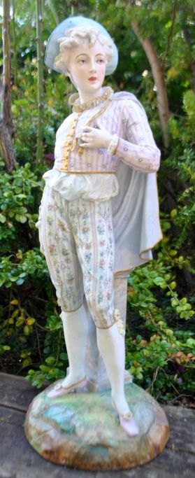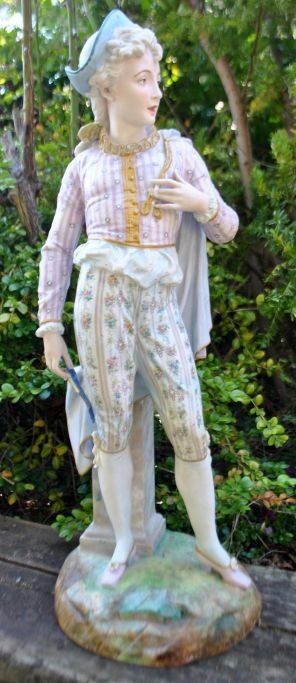 Große Biskuitporzellanfigur eines jungen Mannes, 19. Jahrhundert. Armand Marseilles, Deutschland. Kalt bemaltes und vergoldetes Porzellan. Gestempelt. H: 55,5 cm.NB: Absplitterung auf der Rückseite des Hutes und Pfeil und Bogen abgebrochen.