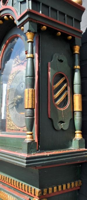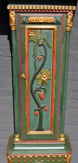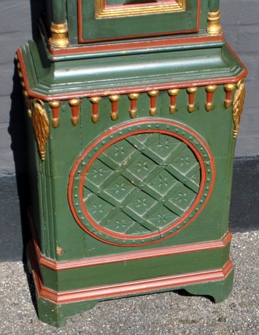 Bemalte Standuhr, 1789, Knud Pedersen Skodborg. Ringkøbing. Dänemark. Grün bemaltes Kiefernholzgehäuse mit zahlreichen Schnitzereien, unter anderem in Form von Weinreben. Mit Vergoldung. Zahnschliff. Schwanenhals-Oberteil. 3/4 Säulen. Waffeldekor am Boden des Gehäuses. Zinnzifferblatt. Mit Minutenzeiger. Uhrwerk mit zwei Glocken. H: 235 cm. B: 45 cm. T: 25.Knud Pedersen Skodsborg, Uhrmacher in Ringkøbing. Geboren ca. 1755 in Ulfborg. 1801 als Uhrmacher und Haushälter in Kirkeby, Ulfborg, als Bauer und Grundbesitzer erwähnt. Scheint auch in Skodborg aktiv gewesen zu sein. Von seiner Hand sind mehrere Werke bekannt. Er war zweimal verheiratet. Litt.: Jens Ingvordsen: Urmagere i Danmark für das Jahr 1900, Bd. 1.