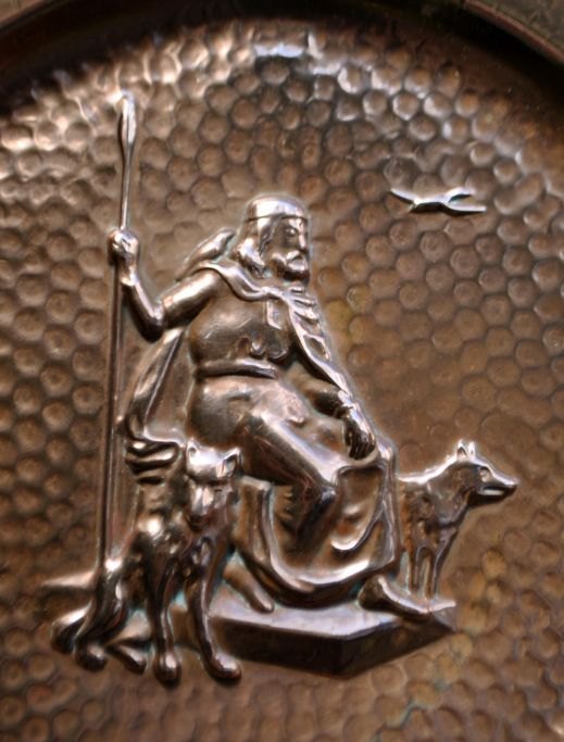 Kupferschale mit Odin-Motiv, 19. Jahrhundert, Dänemark. Motiv von Odin mit Raben und Wölfen. Wikinger-Ornamentik am Rand. Unmarkiert. Durchmesser: 42 cm.Bestellnummer: 28101