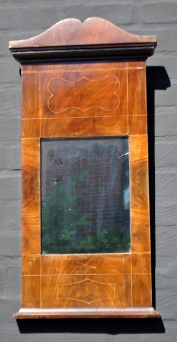 Dänischer Empire-Spiegel aus Mahagoni, ca. 1830. Mit Intarsienarbeit. 70 x 35 cm.NB: Mit kleinem Riss im Glas.