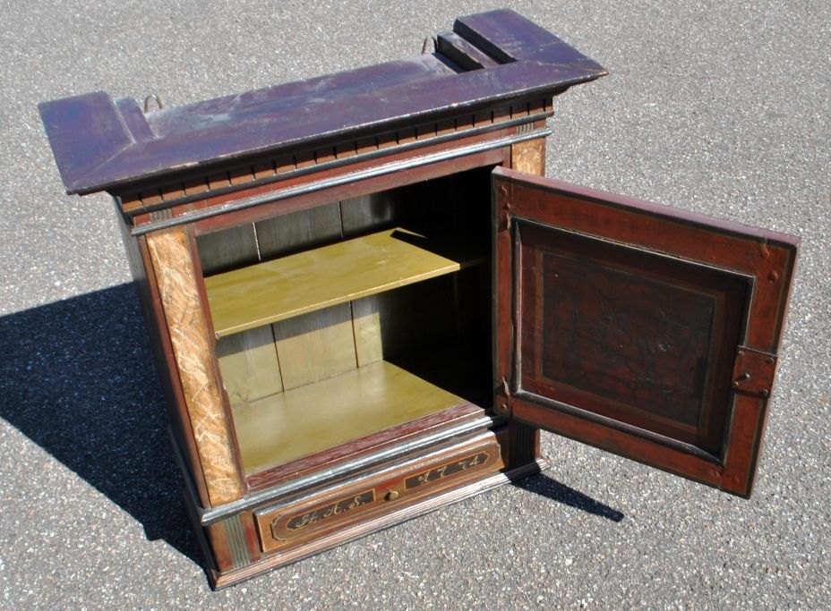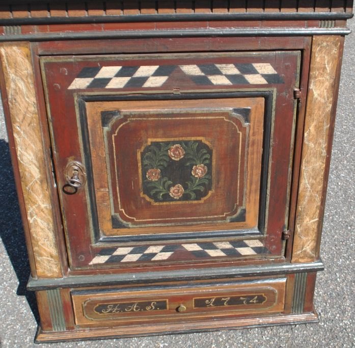 Dänischer bemalter Louis XVI-Hängeschrank, 1774. Mit Zahnschnitt oben und Säulen an den Seiten. Mit einer Schublade. Bemalt mit einem Schachbrettmuster und einer Blumenranke in der Mitte der Tür. Innen mit einem grün bemalten Regal. Mit den Initialen: HAS und 1774 auf der Vorderseite der Schublade. H.: 75 cm. B.: 70 cm. T.: 30 cm.Mit späteren Reparaturen, auch am Rückenteil.