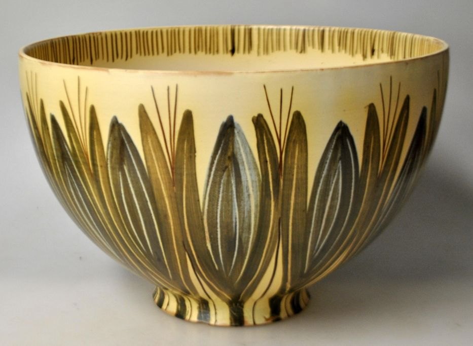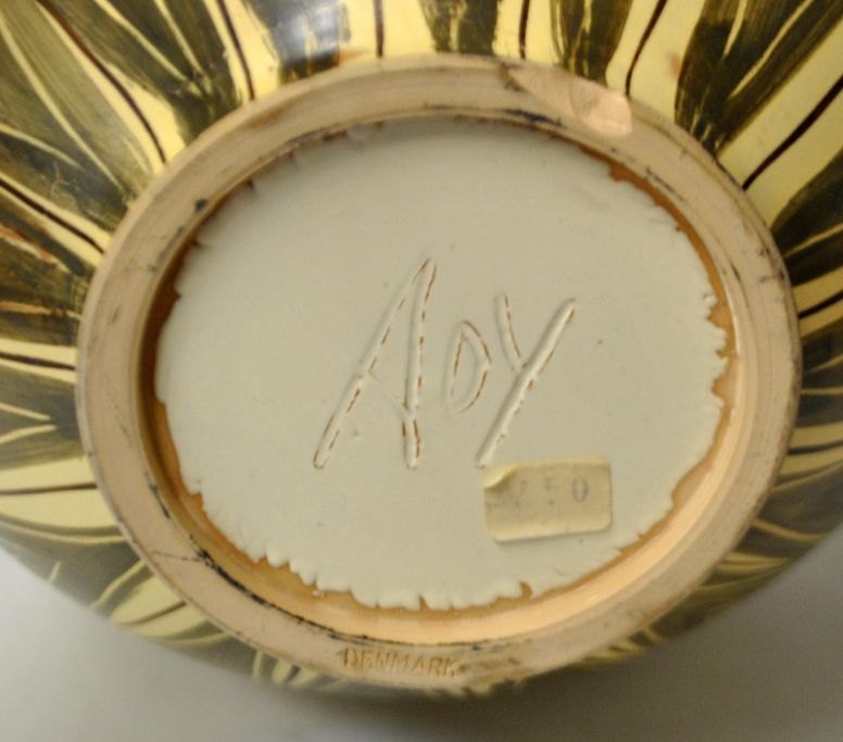Krøyer, Ady (1933 - 2016) Dänemark: Keramische Tischschale. Roter Ton mit gelber, grüner und brauner Glasur. Außen mit einem Blattmuster verziert. Auf der Unterseite - vermutlich ein Samendekor. Innenseiten mit einem Linienmuster verziert. Signiert: Ady, Dänemark. H.: 16 cm. Durchmesser: 24,5 cm.NB: Kleinere Beschädigung an der Ständerkante.