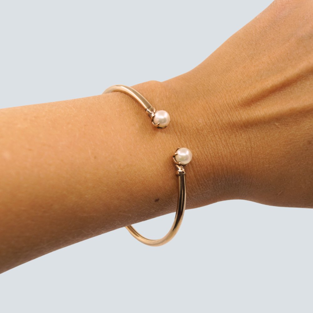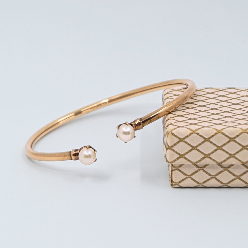 Bernhard Hertz; Armring af 8 kt. guld. Prydet med to perler. Indvendige mål: 6,1 cm x 5,1 cm.