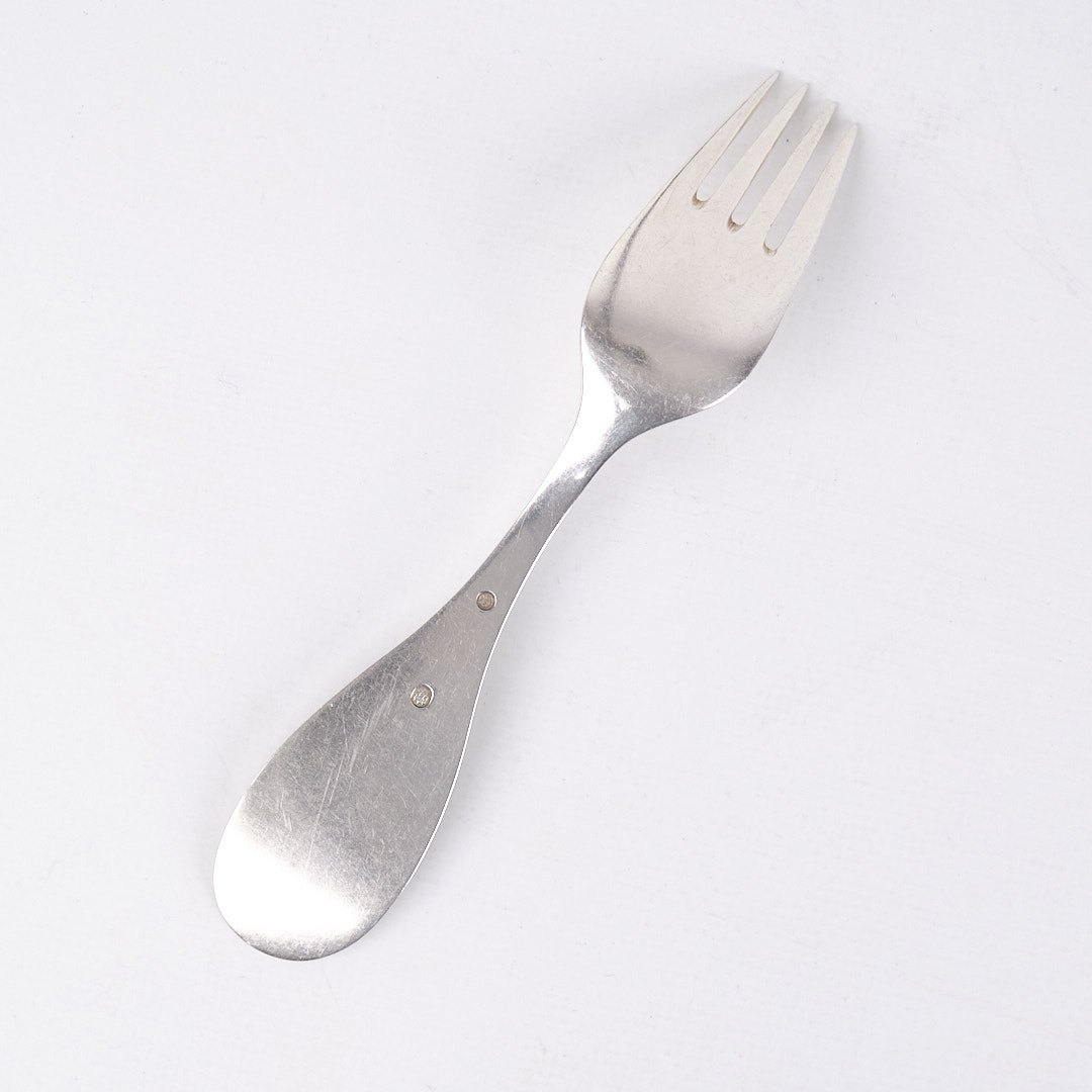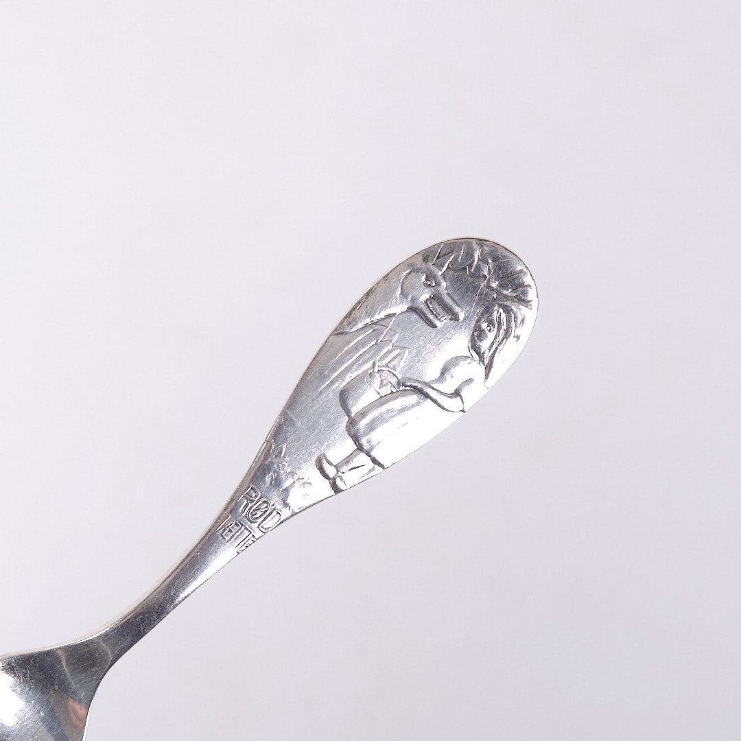 Barnegaffel i tretårnet sølv med motiv af “Den Lille Rødhætte”. Stemplet. Klassisk dansk sølvdesign.— Motiv: “Den Lille Rødhætte”