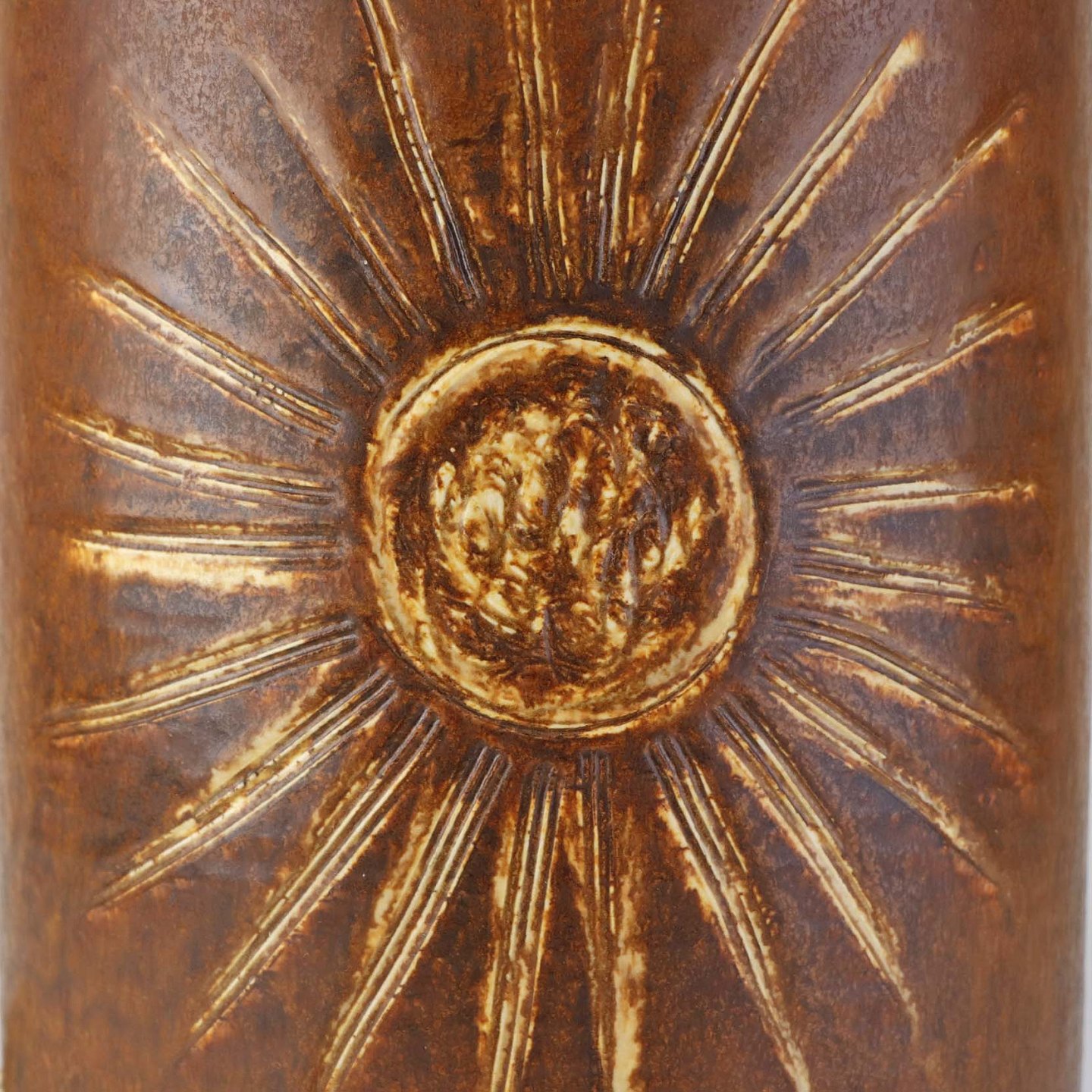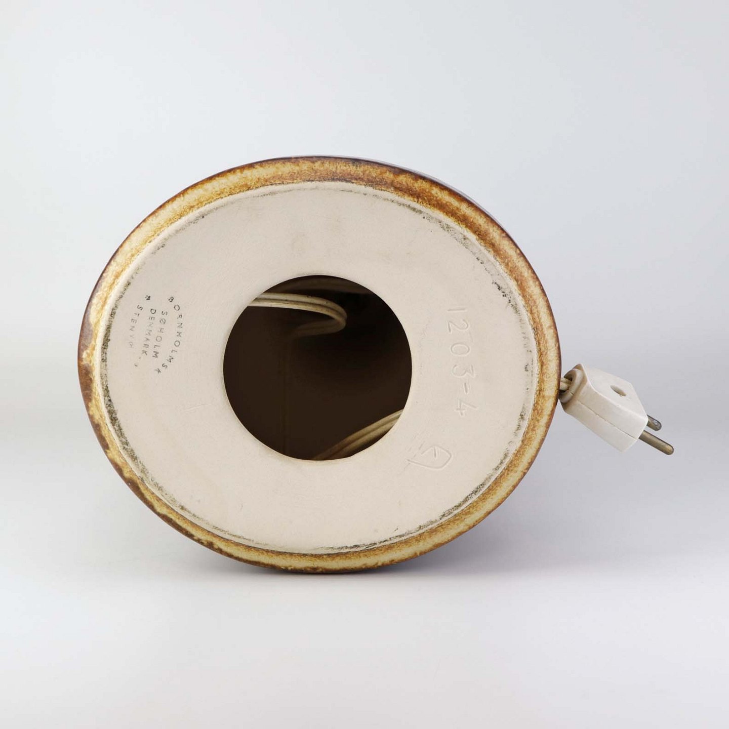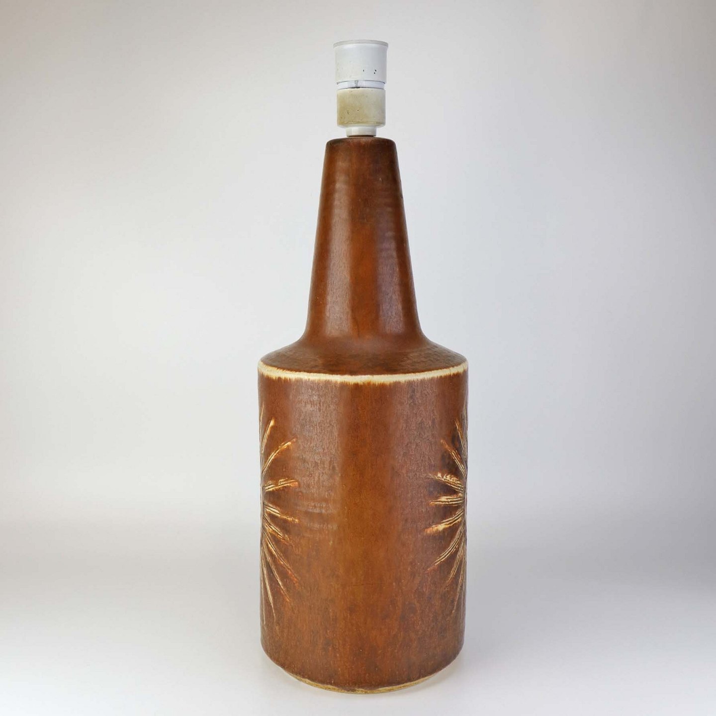 Lampefod i stentøj med gyldenbrun glasur og dekoration af sol. Ledningen er opbevaret i foden. Nr. 1203-4Producent Søholm keramik, Bornholm