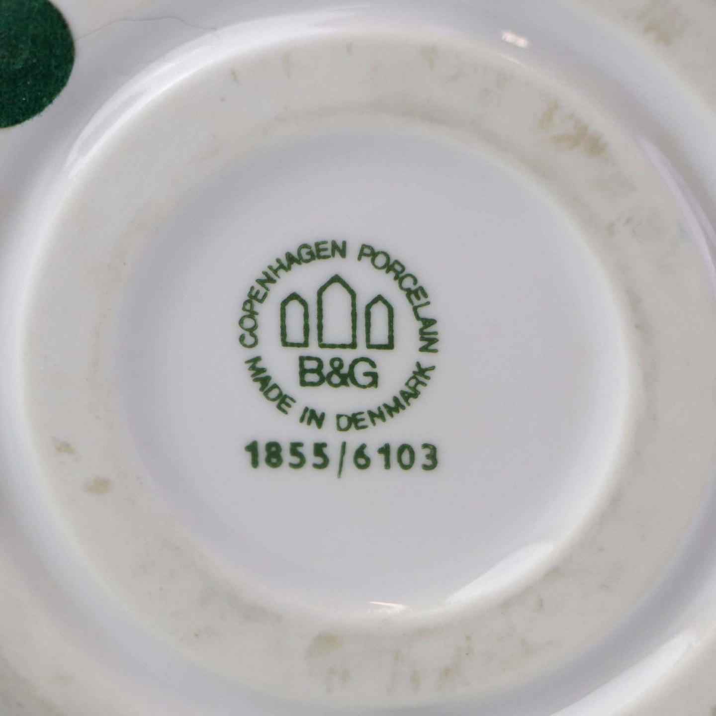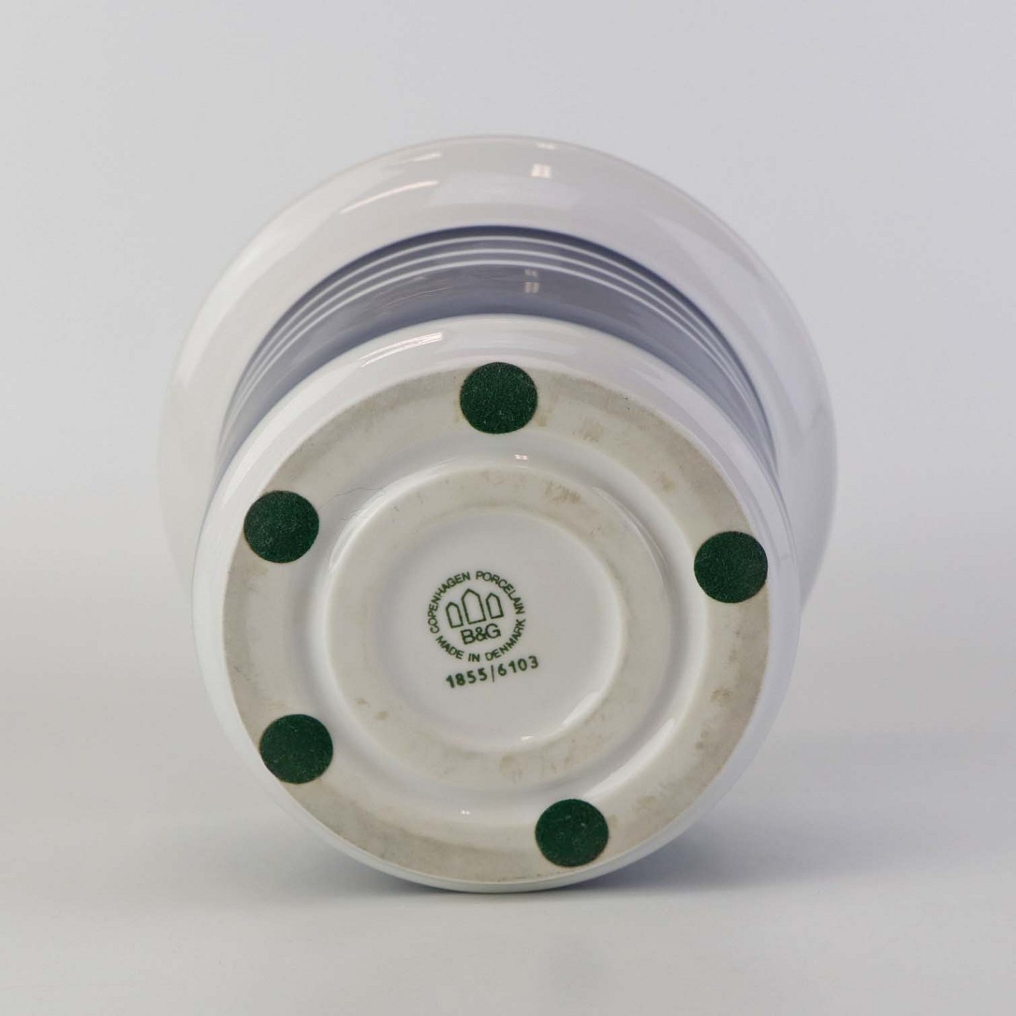 Mellemstørrelse urtepotteskjuler i glat hvidt porcelæn dekoreret med blå striber. Nr. 1855/6103Formgiver Edith Sonne