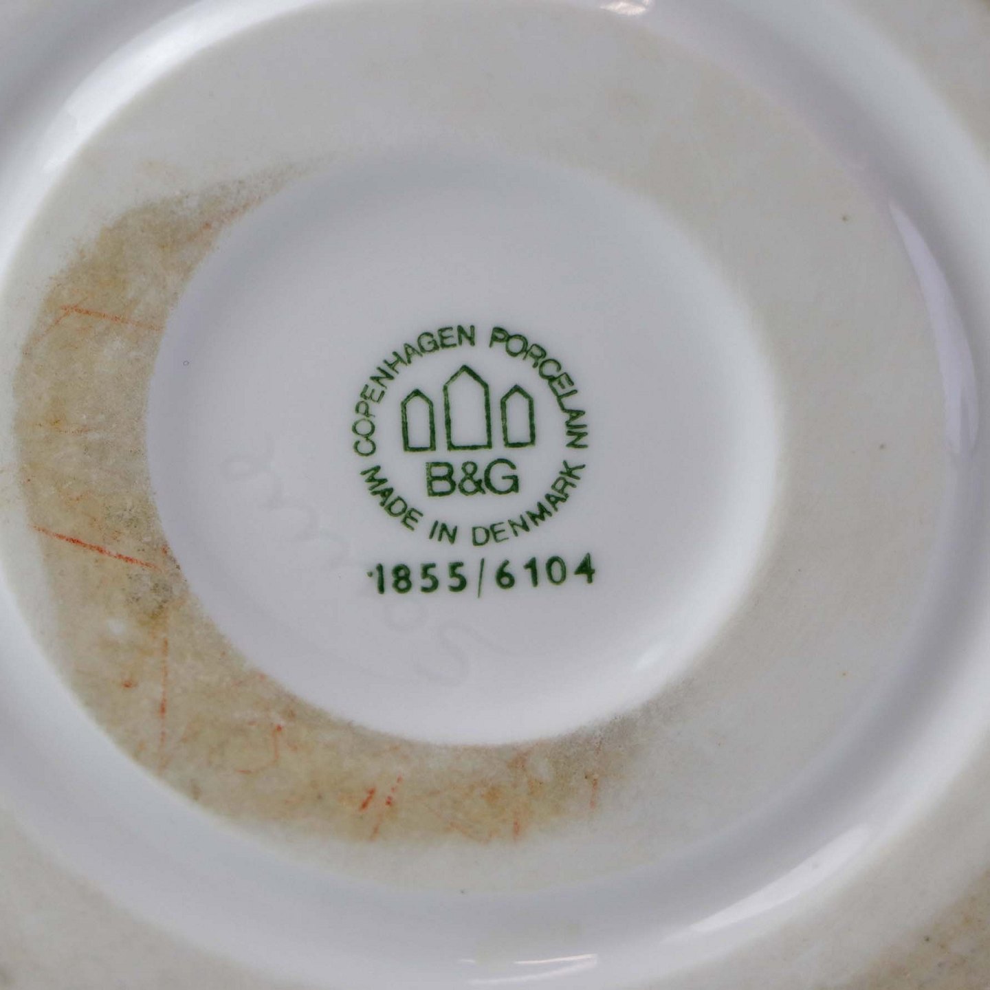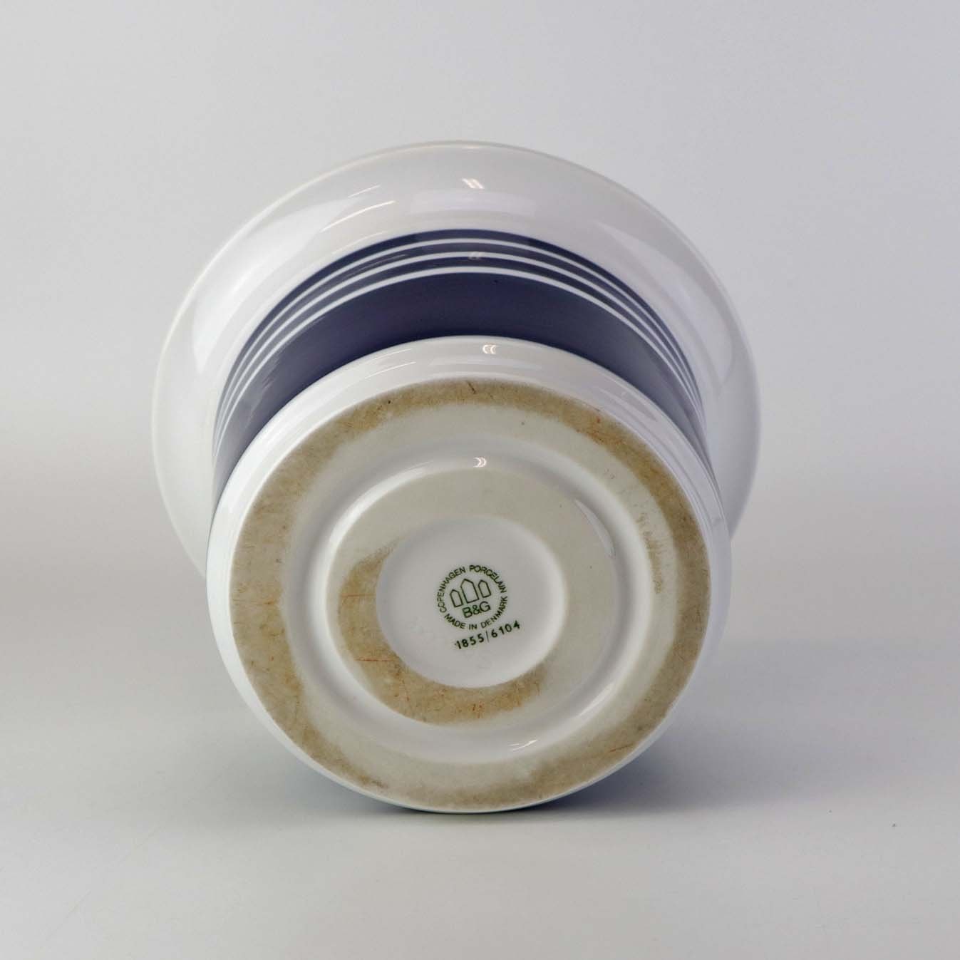 Urtepotteskjuler i glat hvidt porcelæn dekoreret med blå striber. Nr. 1855/6104Formgiver Edith Sonne