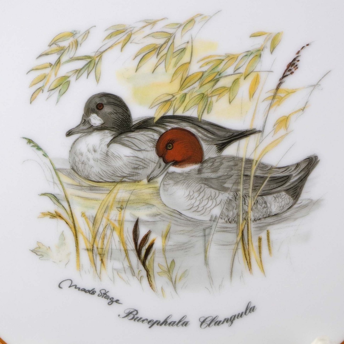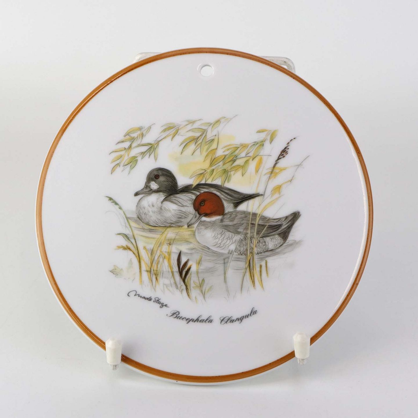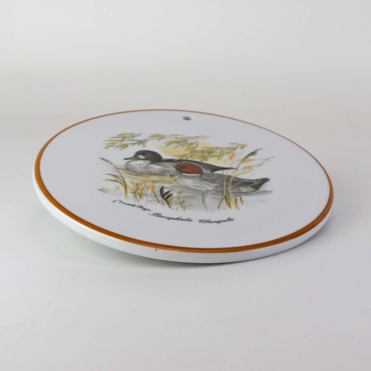 Rund smørbrik i porcelæn med forboret hul til ophæng og motiv af ænder fra stellet Jagtstel.Formgiver Mads Stage