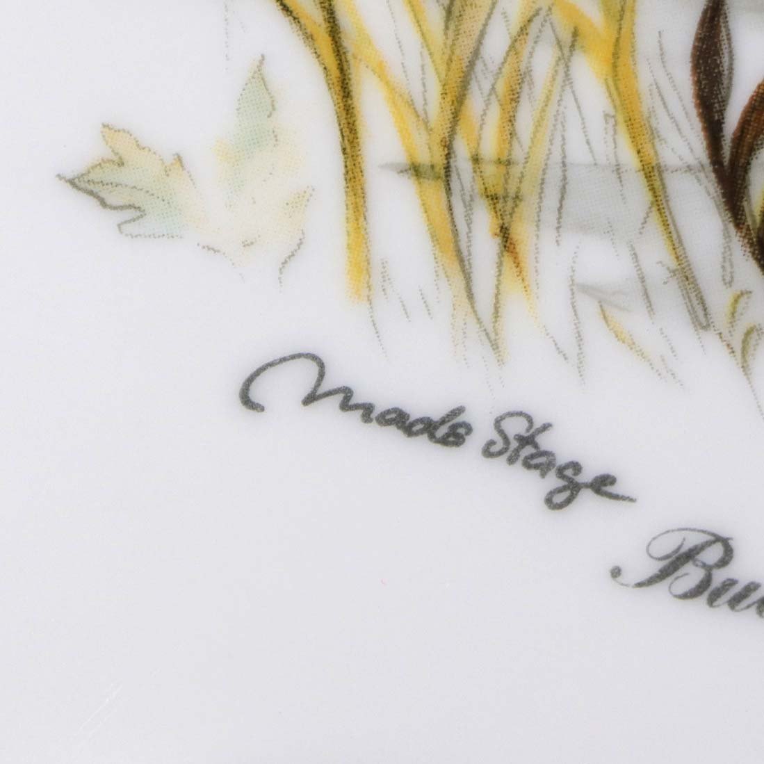 Jagtstellet er i glat hvidt porcelæn med gyldenbrun kantdekoration og motiver af forskellige vilde danske dyr i deres naturlige miljø. Stellet er holdt i dæmpede varme efterårsfarver.