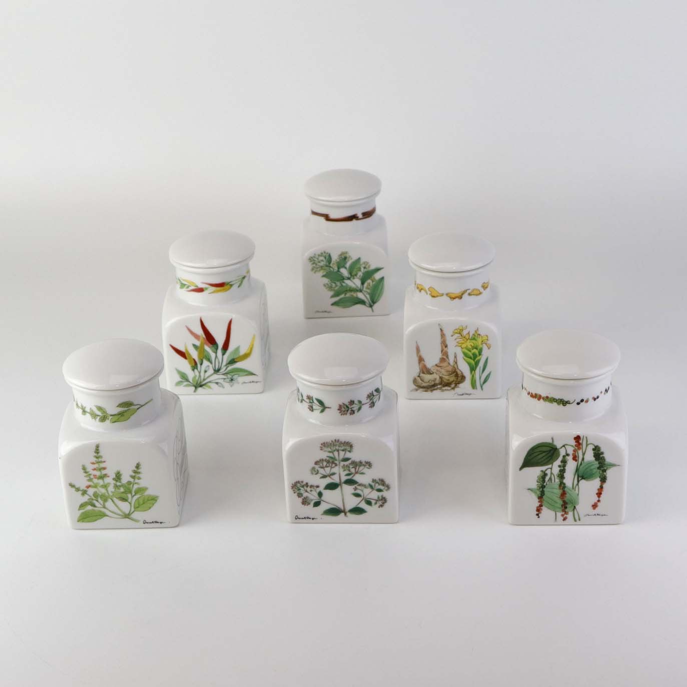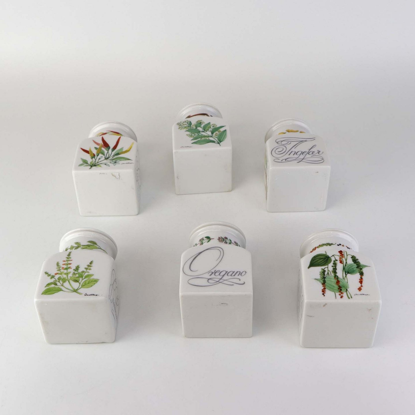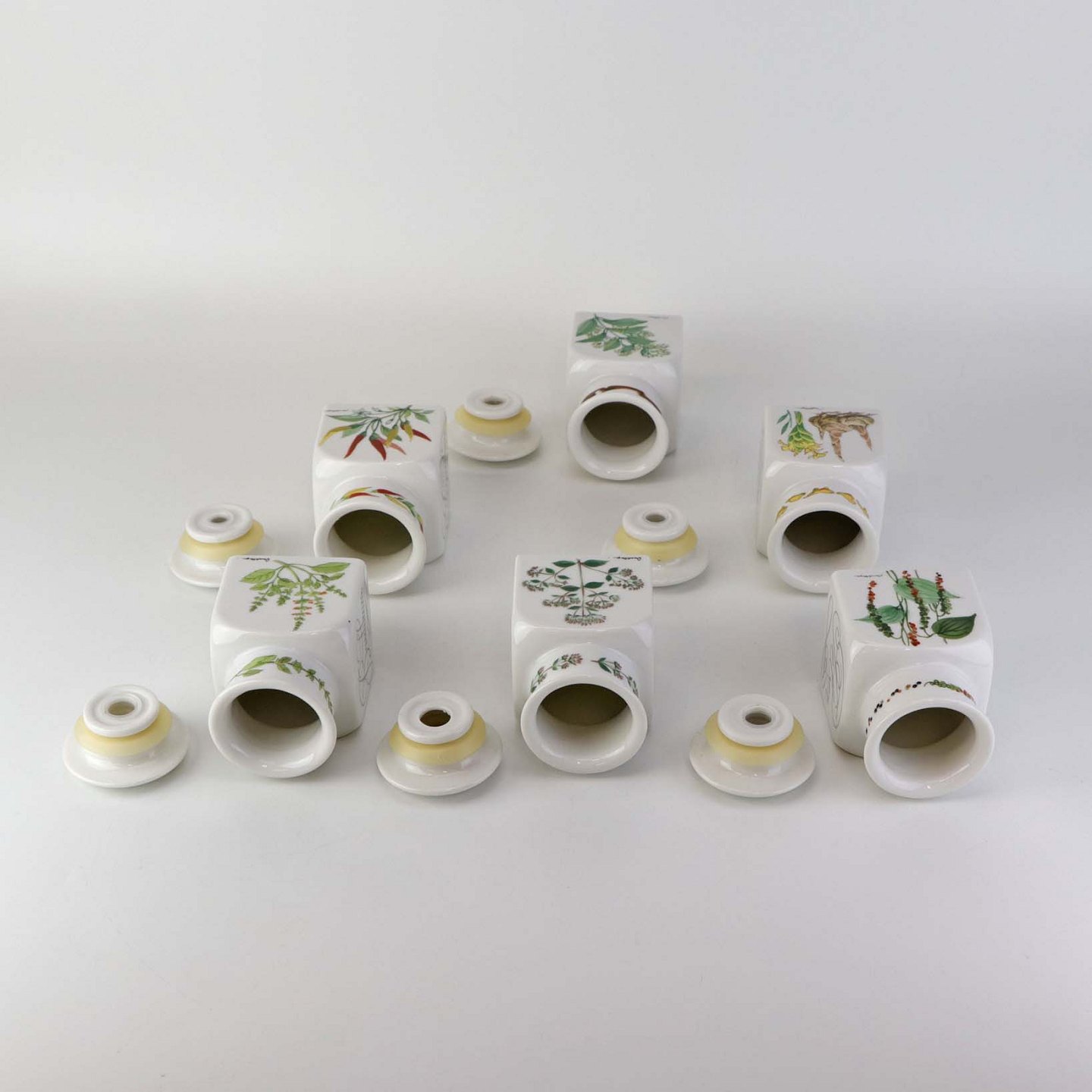 Forskellige krydderurte krukker i porcelæn med aftagelig top og gummiforsejling dekoreret med urtemotiv og tekst.Formgiver Mads Stage