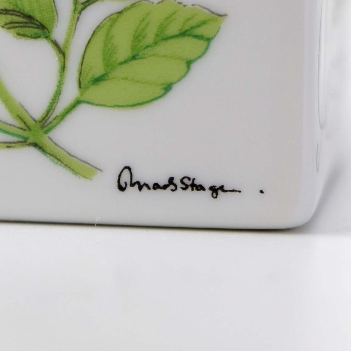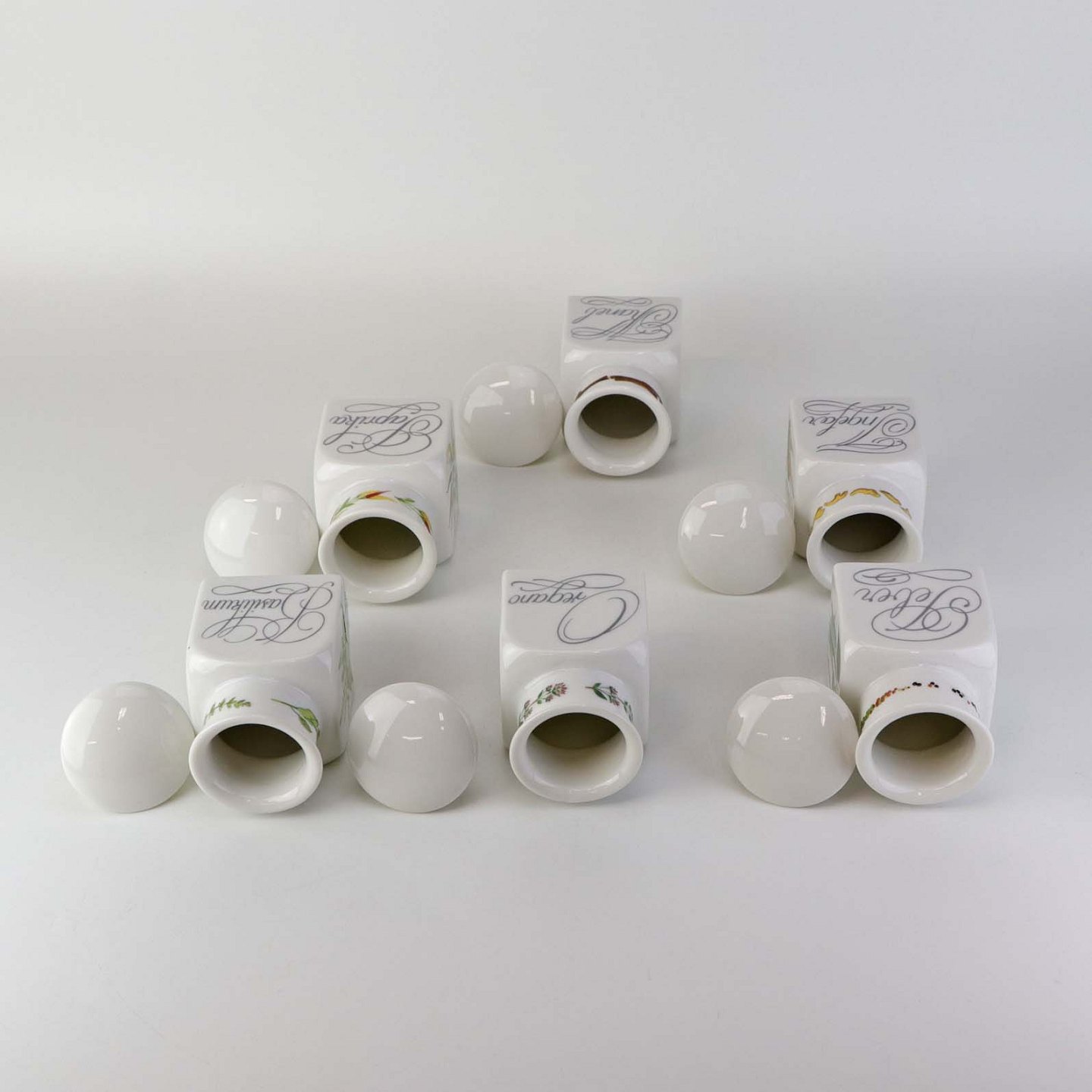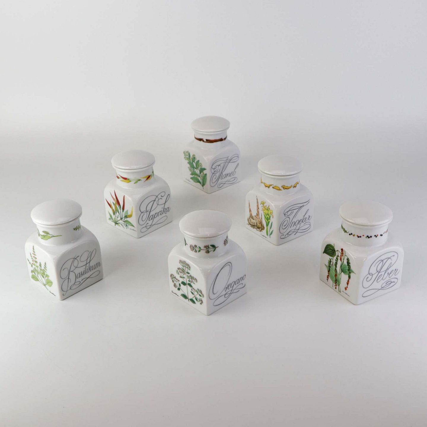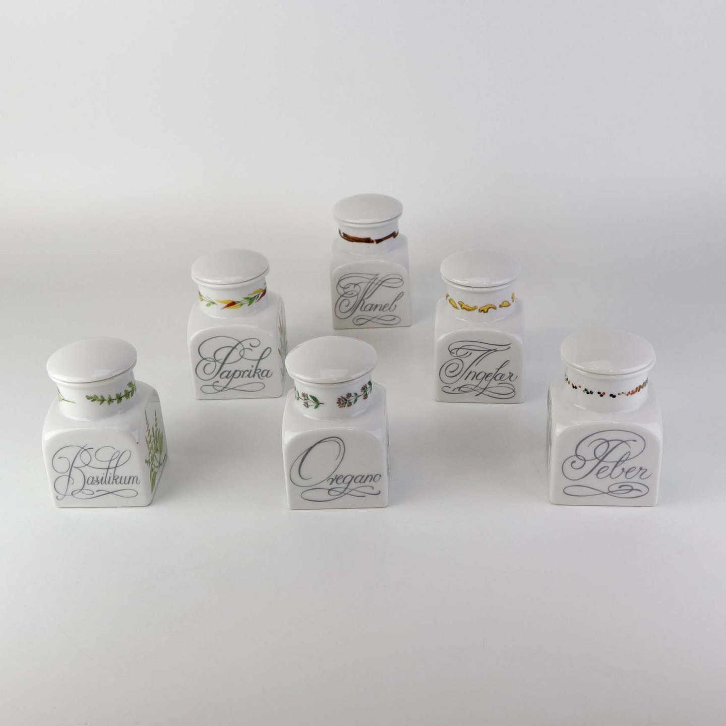 Forskellige krydderurte krukker i porcelæn med aftagelig top og gummiforsejling dekoreret med urtemotiv og tekst.Formgiver Mads Stage