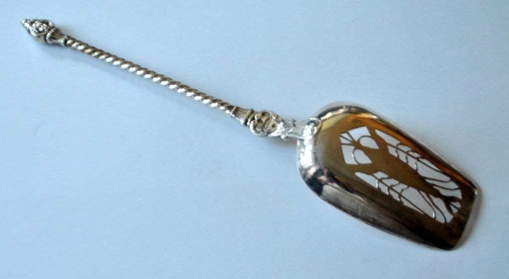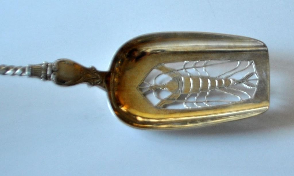 Silber Krabbenlöffel, Kopenhagen, 1869. Nicht identifizierbare Meistermarke. Mit Stadtwappen und Guardein-Marke. Griff mit Krabbe und Innenvergoldung. Gedrehter Griff mit Engelskopf. L: 22 cm.Bestellnummer: 28110