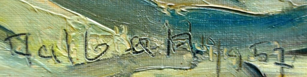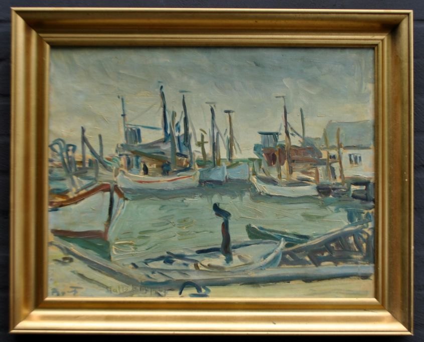 Bernhardt-Frederiksen, Aage (1883 - 1963) Dänemark: Der Hafen in Aalbæk. Öl auf Leinwand. Unterzeichnet am 19.9.1957. 44 x 60 cm.Verso signiert.