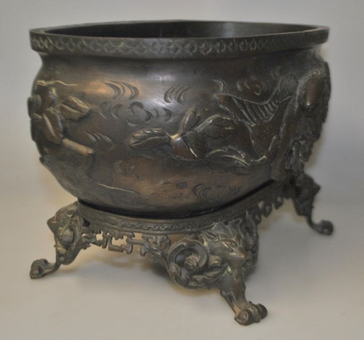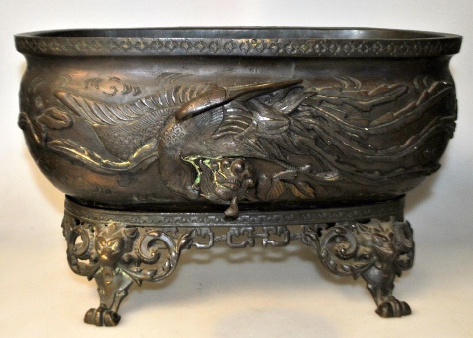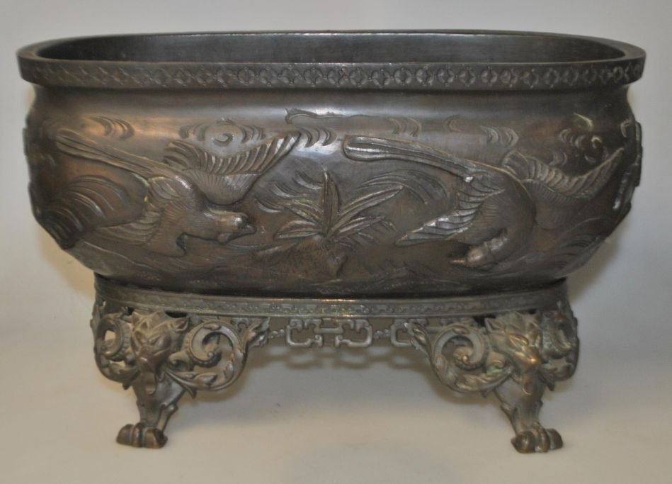 Große chinesische Blumenjardiniere aus Bronze, 19. Jahrhundert. Auf vier Löwenfüßen. Mit Randverzierungen. Seiten mit großem Drachen und Vögeln verziert. L.: 32 cm. B.: 19 cm. H.: 18 cm.Perfekter Zustand!