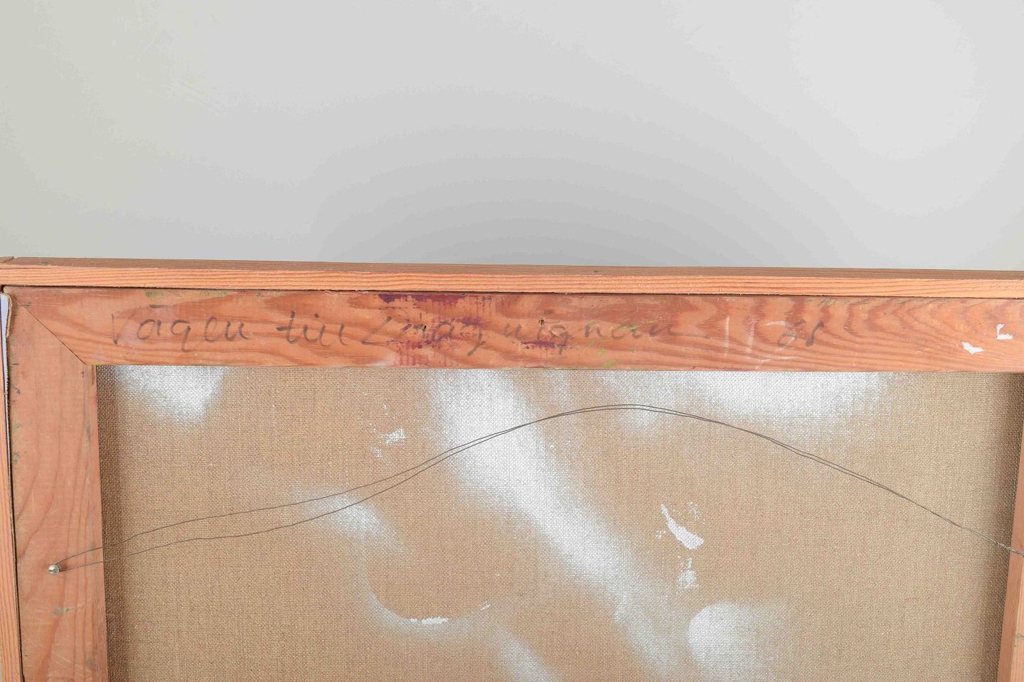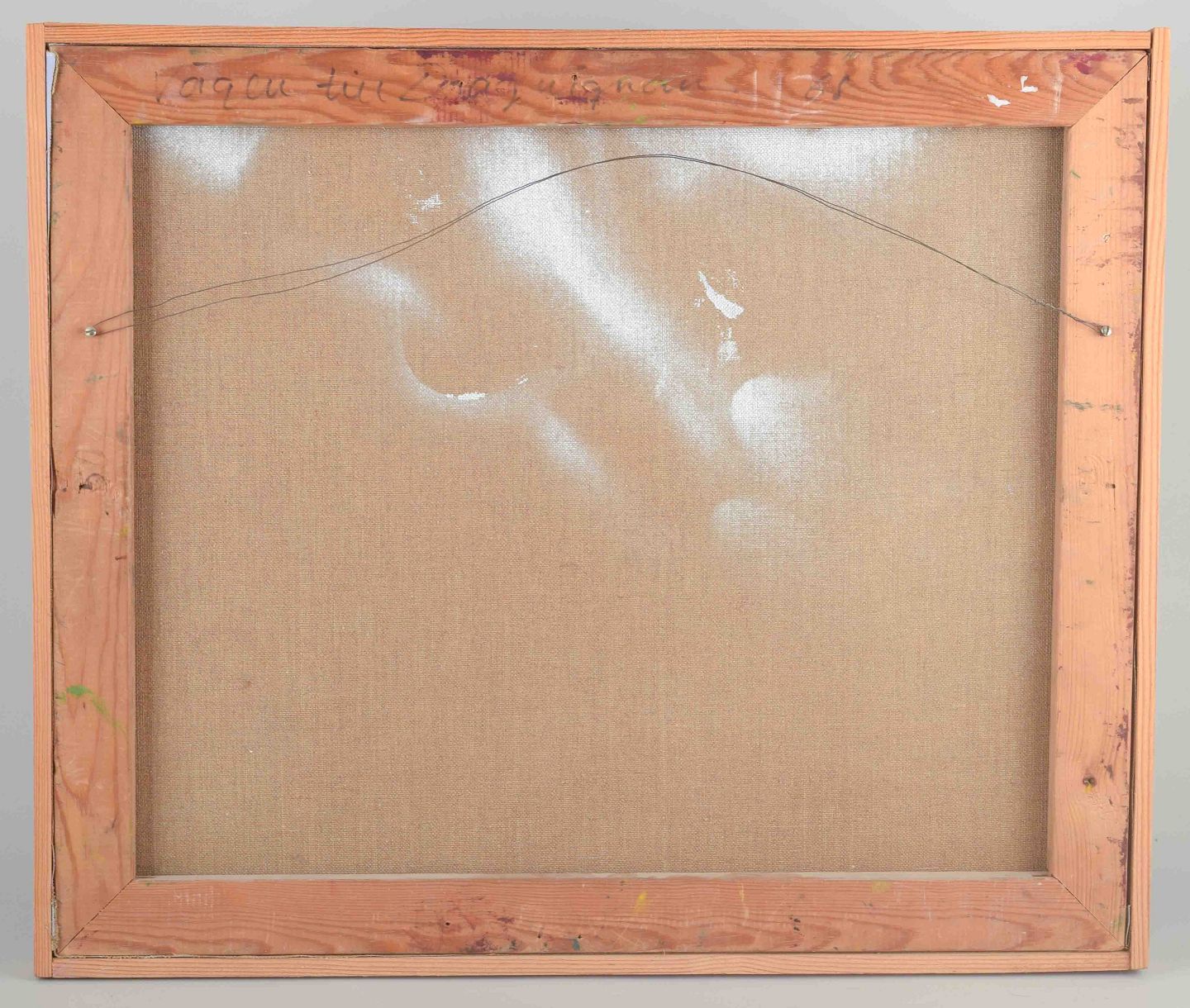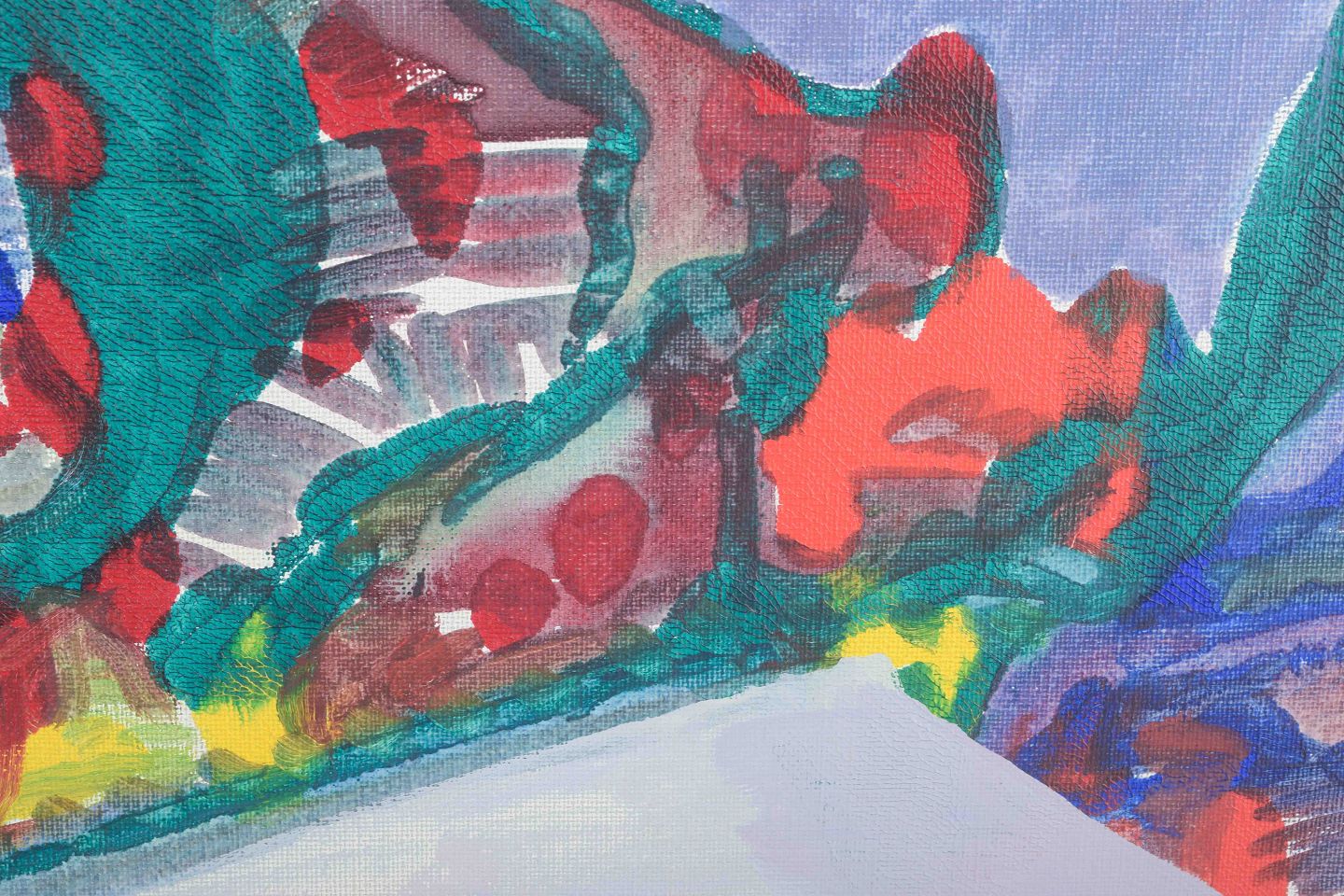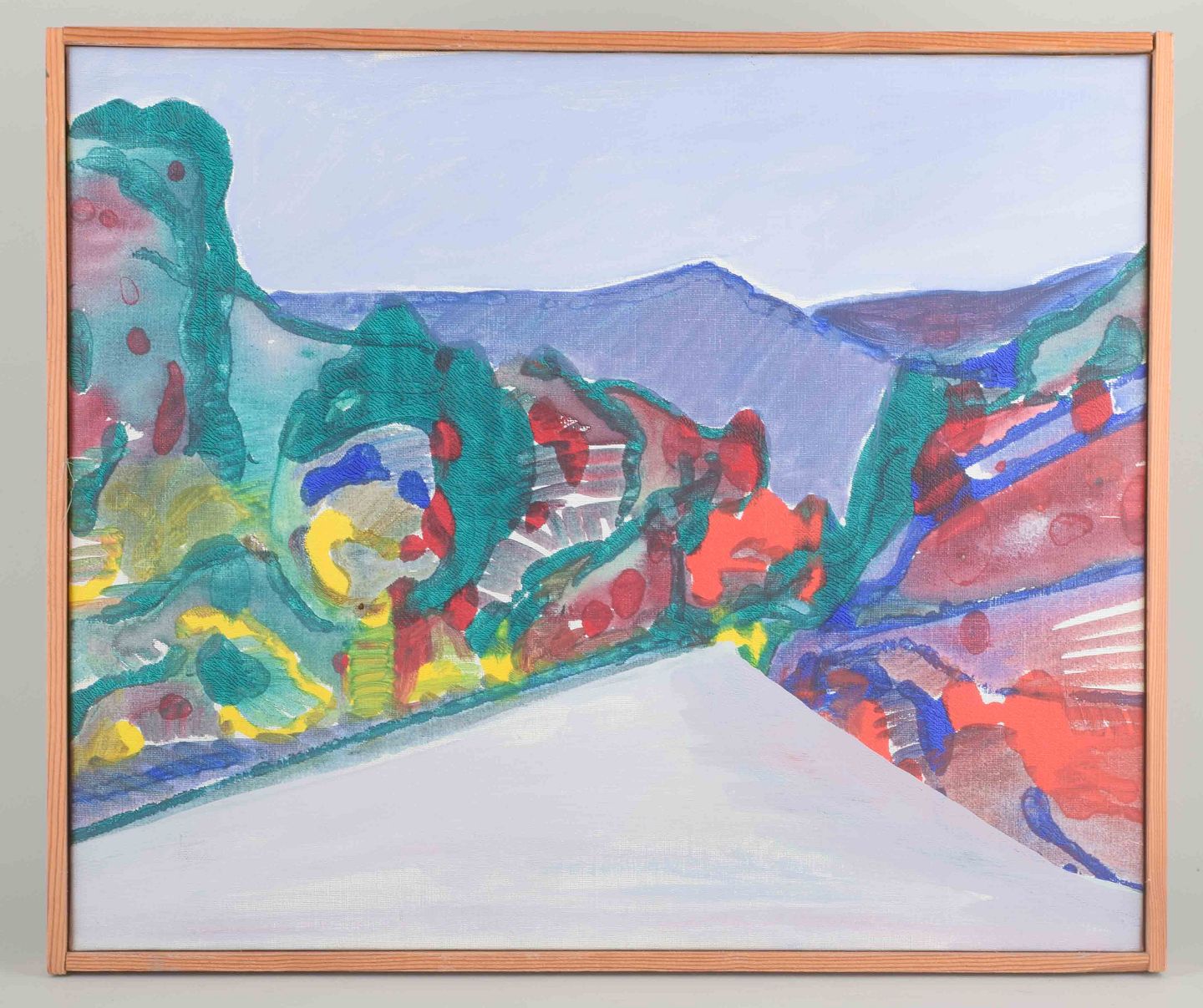 Et koloristisk og ekspressivt modernistisk landskab, hvor klare farver i grønne, røde og gule toner smelter sammen i organiske felter. Kompositionen er præget af en dynamisk kontrast mellem de farvemættede forgrunde og de rolige blå bjergsilhuetter i baggrunden, hvilket skaber en drømmende, næsten abstrakt landskabsstemning.