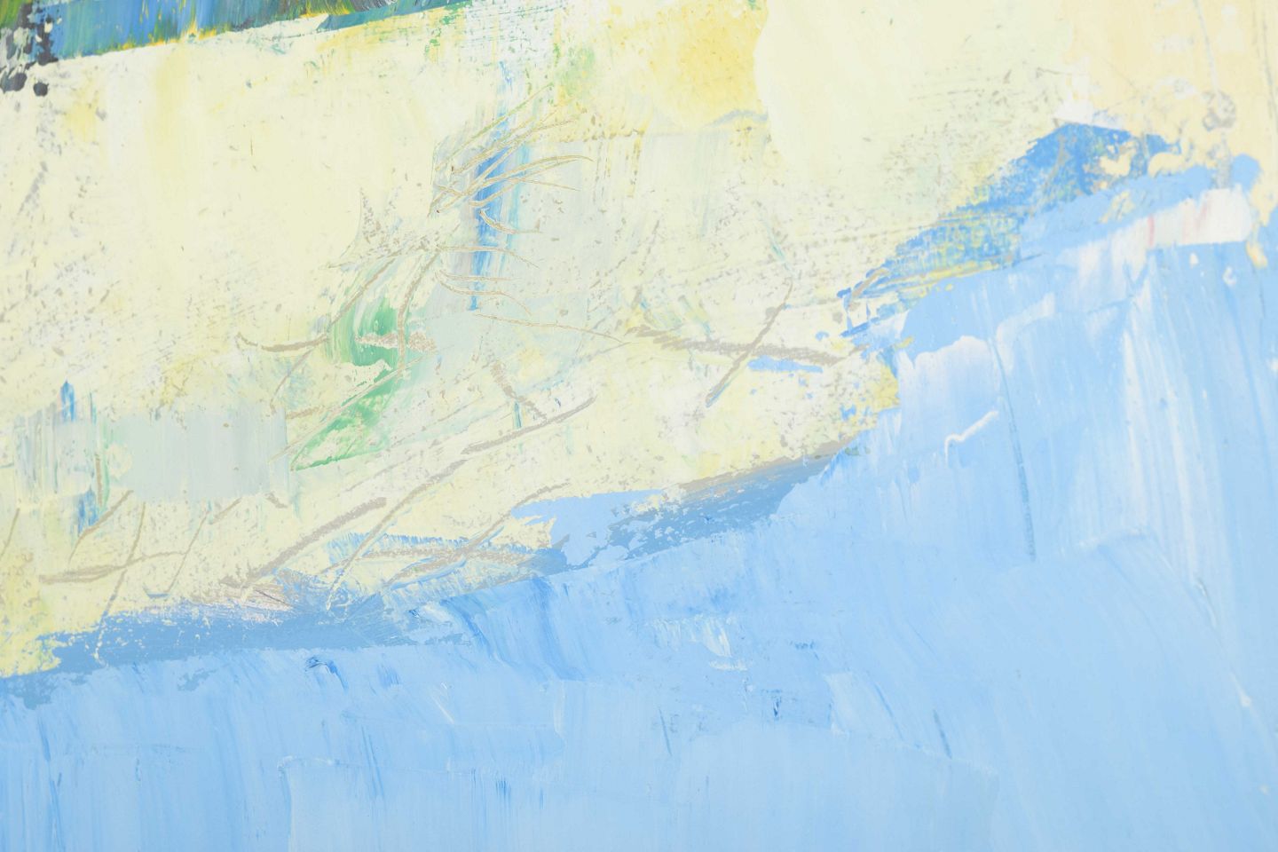 Et modernistisk kystlandskab i lyse blå, grønne og sandfarvede toner, hvor Gotlands karakteristiske klinter og hav mødes i et stiliseret og forenklet billedsprog. Maleriet er præget af en stoflig penselføring og et klart geometrisk formsprog, som fremhæver naturens kontraster og ro.
