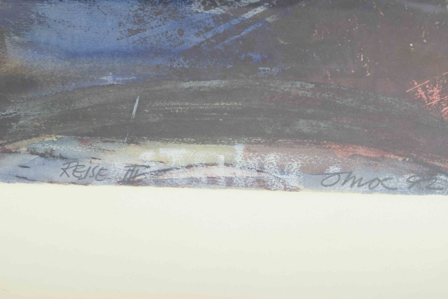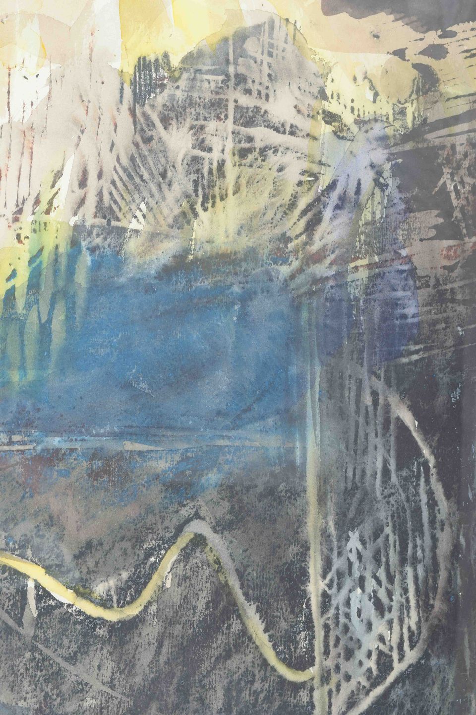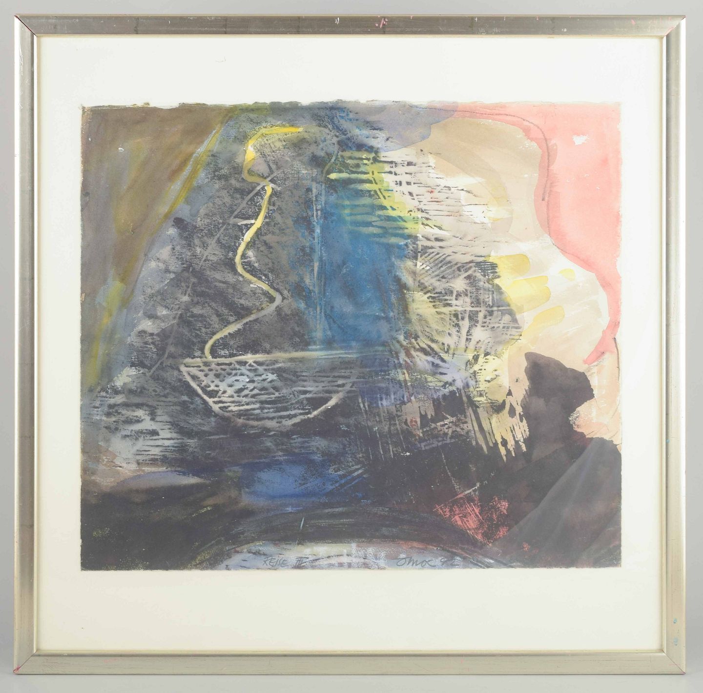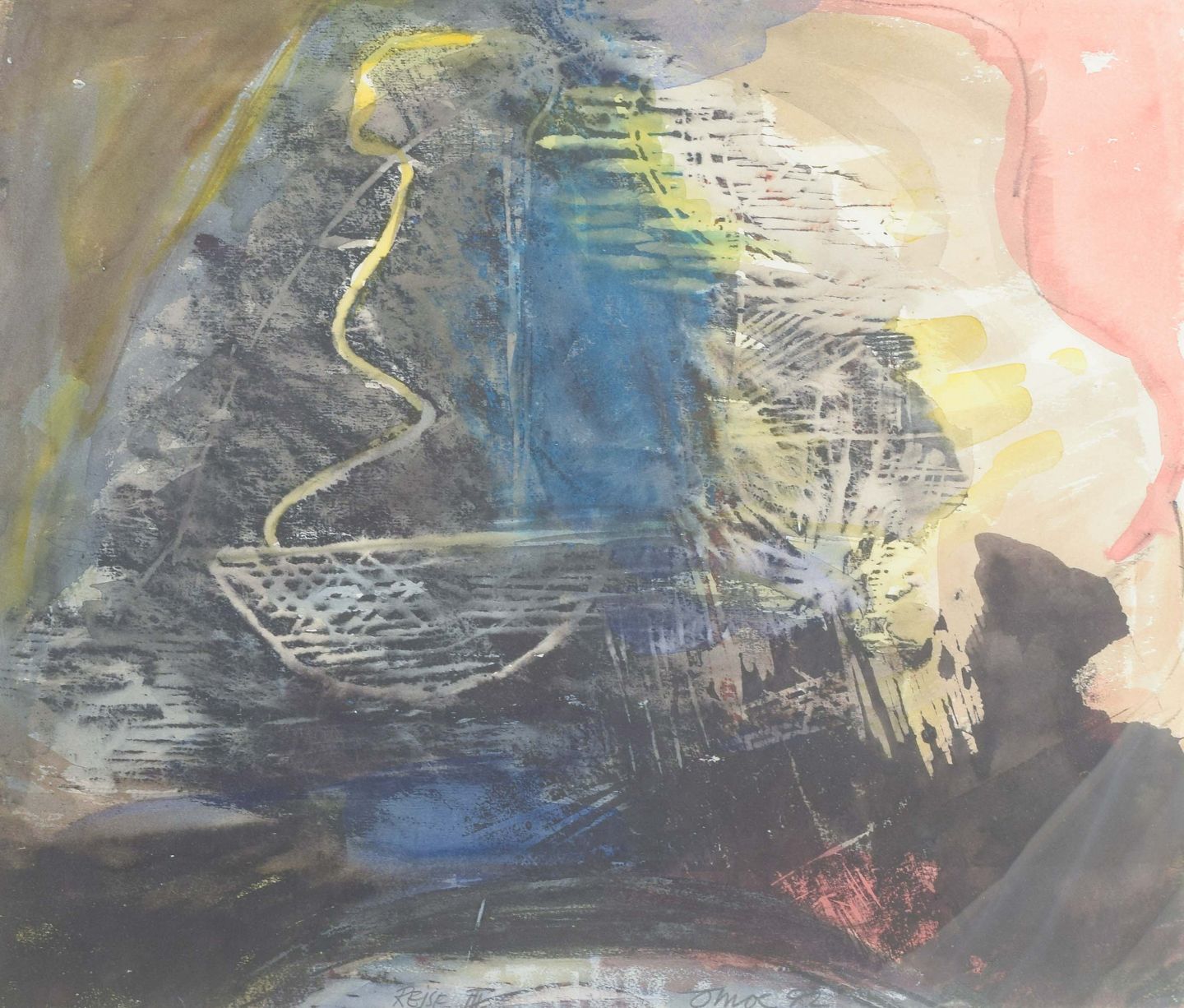 Et ekspressivt abstrakt værk med stærke kontraster og teksturelle effekter, hvor dynamiske penselstrøg i blå, sorte, gule og rosa nuancer danner en dramatisk komposition. Moe arbejder her med lagdelte strukturer og en bevægelse, der giver værket en næsten landskabelig eller kosmisk karakter.