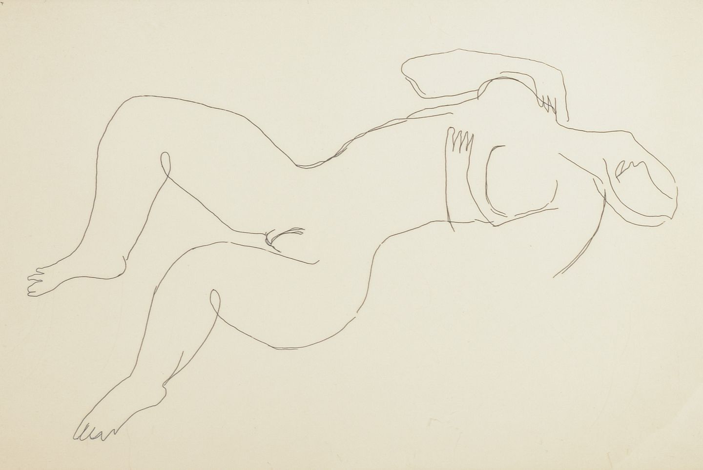 Et grafisk værk med motiv af en nøgen kvindeskikkelse i hvilende positur, udført i en enkel, lineær stil med kubistisk præg. Med få men præcise streger skaber Fautrier en intens og raffineret figurkomposition, der balancerer mellem naturalisme og abstraktion.