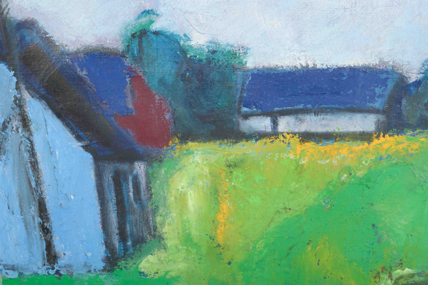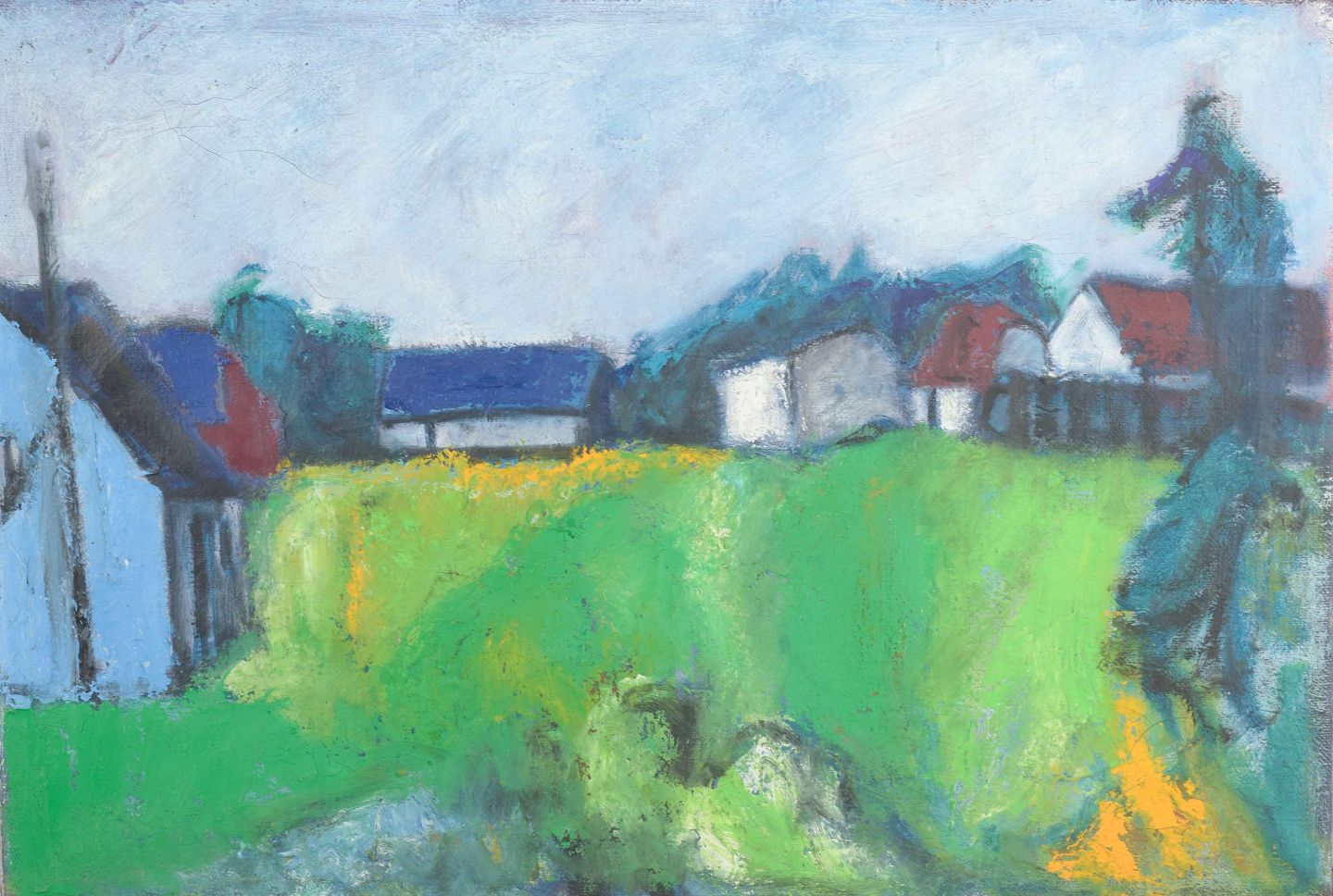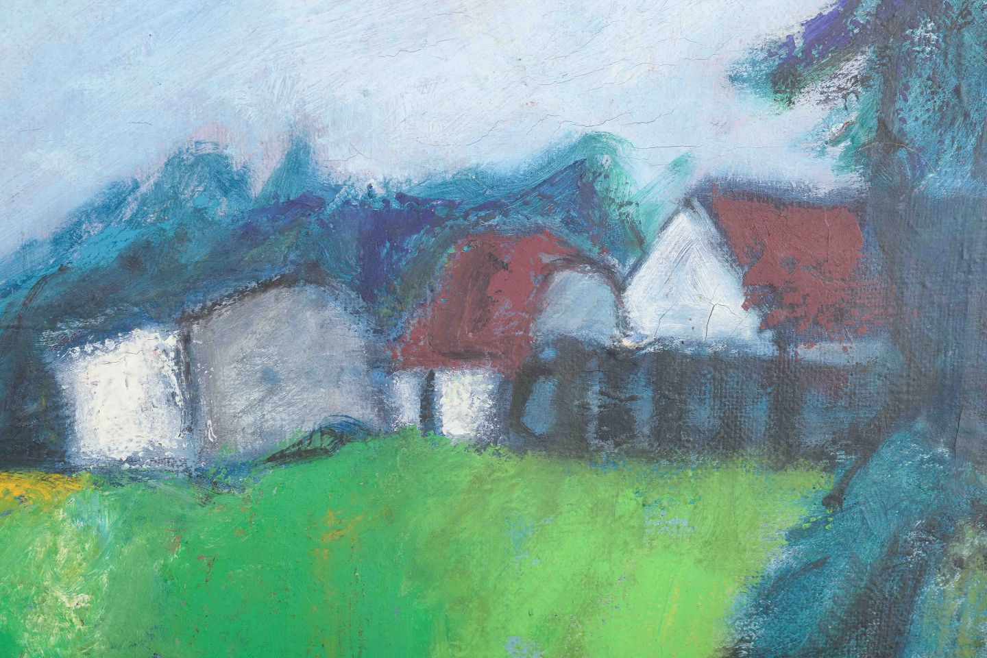 Et stemningsfuldt og ekspressivt landskabsmaleri med huse i baggrunden, hvor stærke grønne og blå nuancer dominerer billedfladen. Penselstrøgene er frie og spontane, hvilket giver værket en intensitet og en levende atmosfære, som er karakteristisk for Madsens billedsprog.