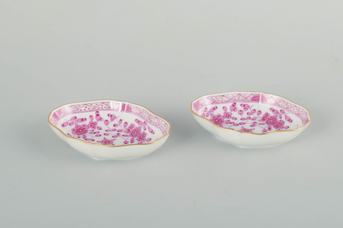 To ovale porcelænsskåle, håndmalet i det klassiske mønster "Pink Indian", dekoreret med rosa blomster og blade samt guldbemaling på kant.
