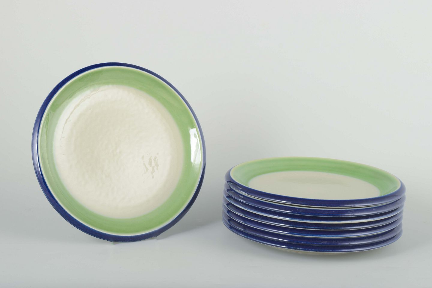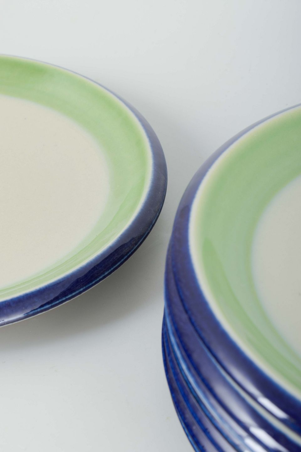 Sæt af otte tallerkener i fajance med hvid glasur, grøn og blå dekoration.