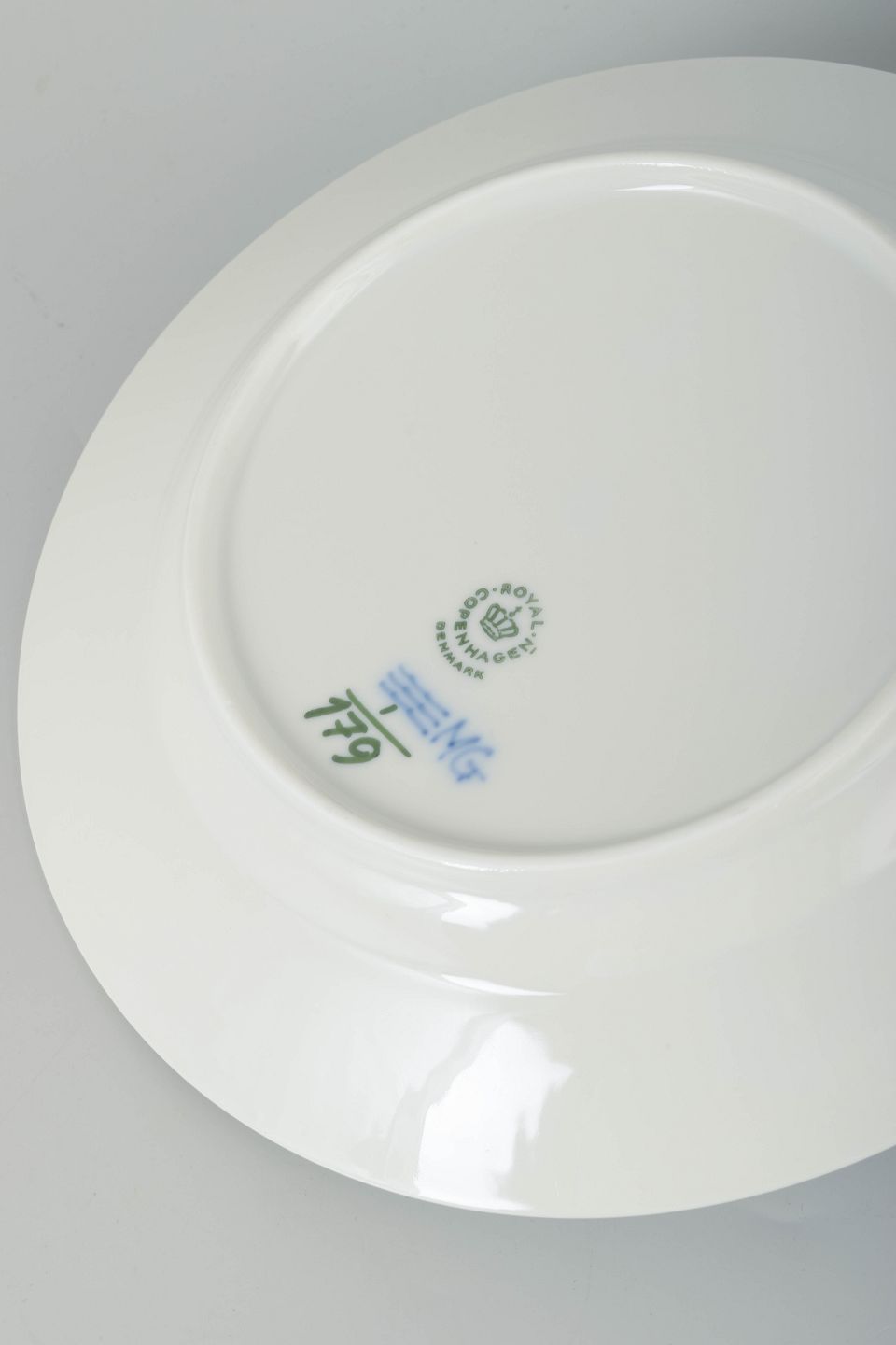Musselmalet Riflet er Royal Copenhagens ældste og mest ikoniske stel, skabt i 1775 og stadig i produktion i dag. Det håndmalede blå mønster er inspireret af kinesisk porcelæn og blev et symbol på dansk porcelænskunst. Tallerkener fra slutningen af 1900-tallet er populære blandt samlere for deres håndværksmæssige kvalitet og tidløse æstetik, og de viser kontinuiteten i en af Danmarks mest traditionsrige porcelænsserier.