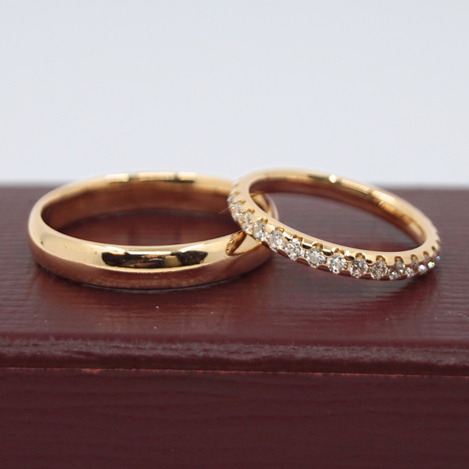 Becher; Sæt vielsesringe i 18 kt. guld, ene prydet med diamanter