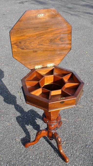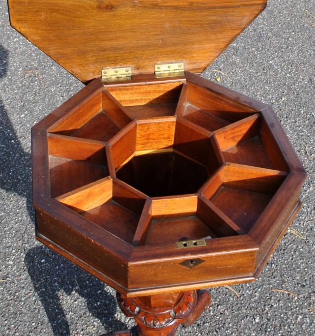 8-seitiger Nähtisch aus Walnussholz mit Intarsien, 19. Jahrhundert. Dänemark. Auf geschnitztem Dreibein. 8-seitige Säule zur Garnaufbewahrung. 8-seitige Platte mit Tischplatte. Innen mit 8 Fächern. Mit Schlüssel und Schloss. Platte mit Intarsien in Sternmuster verziert. Poliert. H.: 72 cm. Durchmesser Platte: 42 cm.Toller, toller Zustand!