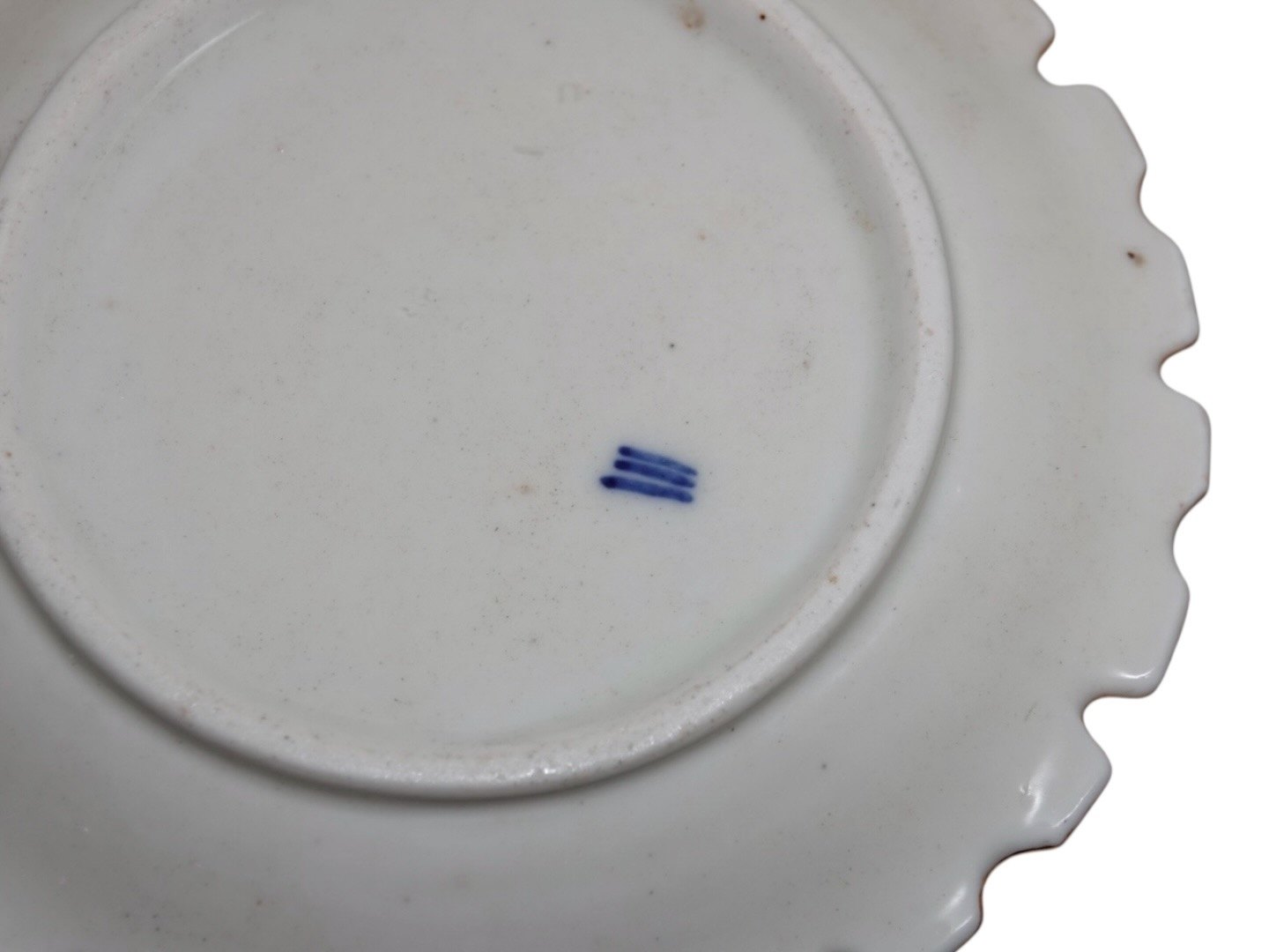 Royal Copenhagen Saksisk Blomst, sjælden smørskål på fast underfad.Af fabriksmærket kan det udledes, at denne er produceret omkring 1850.