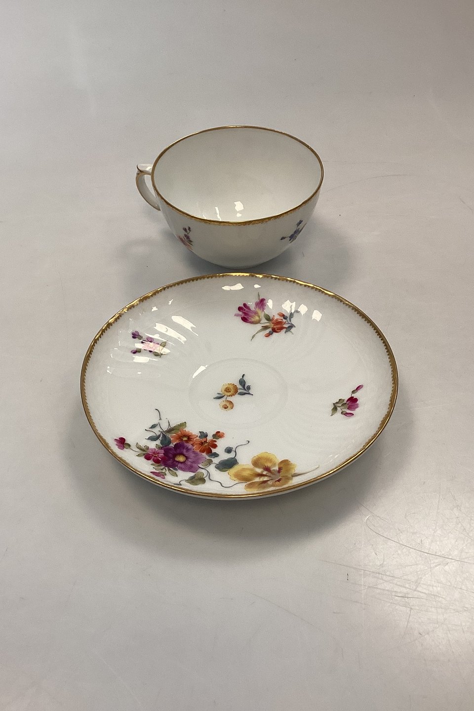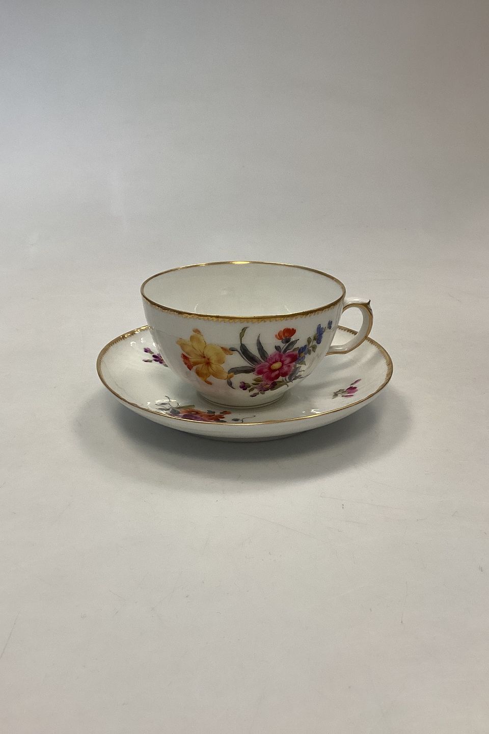 Royal Copenhagen Fuld Saksisk Blomst Stor Tekop No 1550. I fin stand, men lettere slid på guldkanten. Kop måler 11 cm x 6,5 cm / 4,52 in. x 2,55 in. Underkop måler 16.5 cm / 6,5 in.