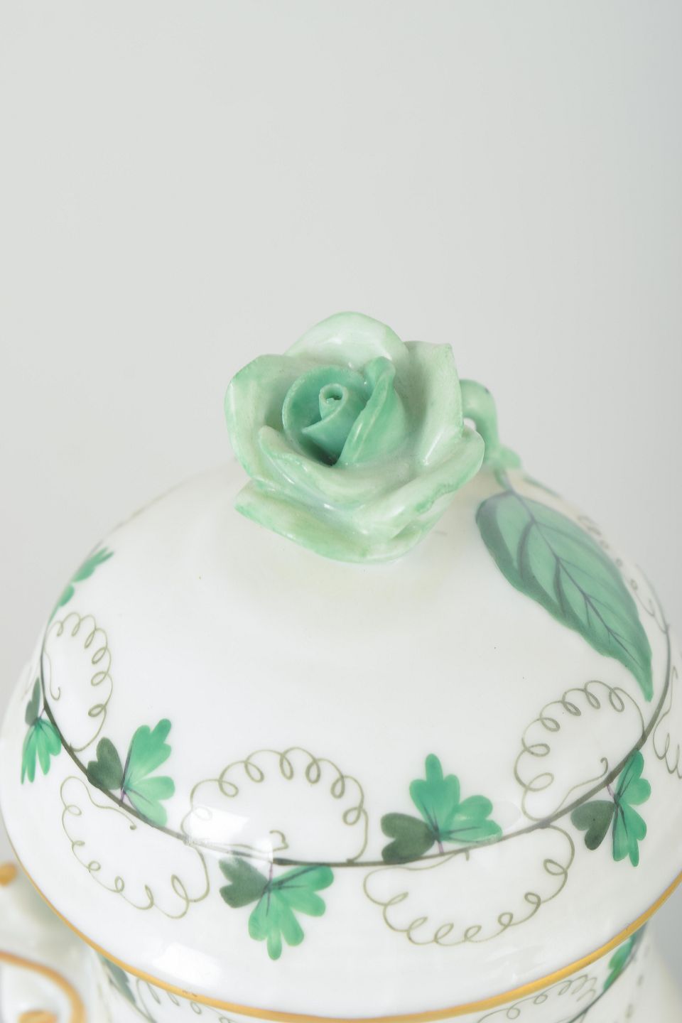 Elegant porcelænskande med håndmalet grønt bladdekor og forgyldte detaljer. Låget afsluttes med knop i form af en grøn porcelænsrose. Klassisk svungen form med dekorativ hank og tud.