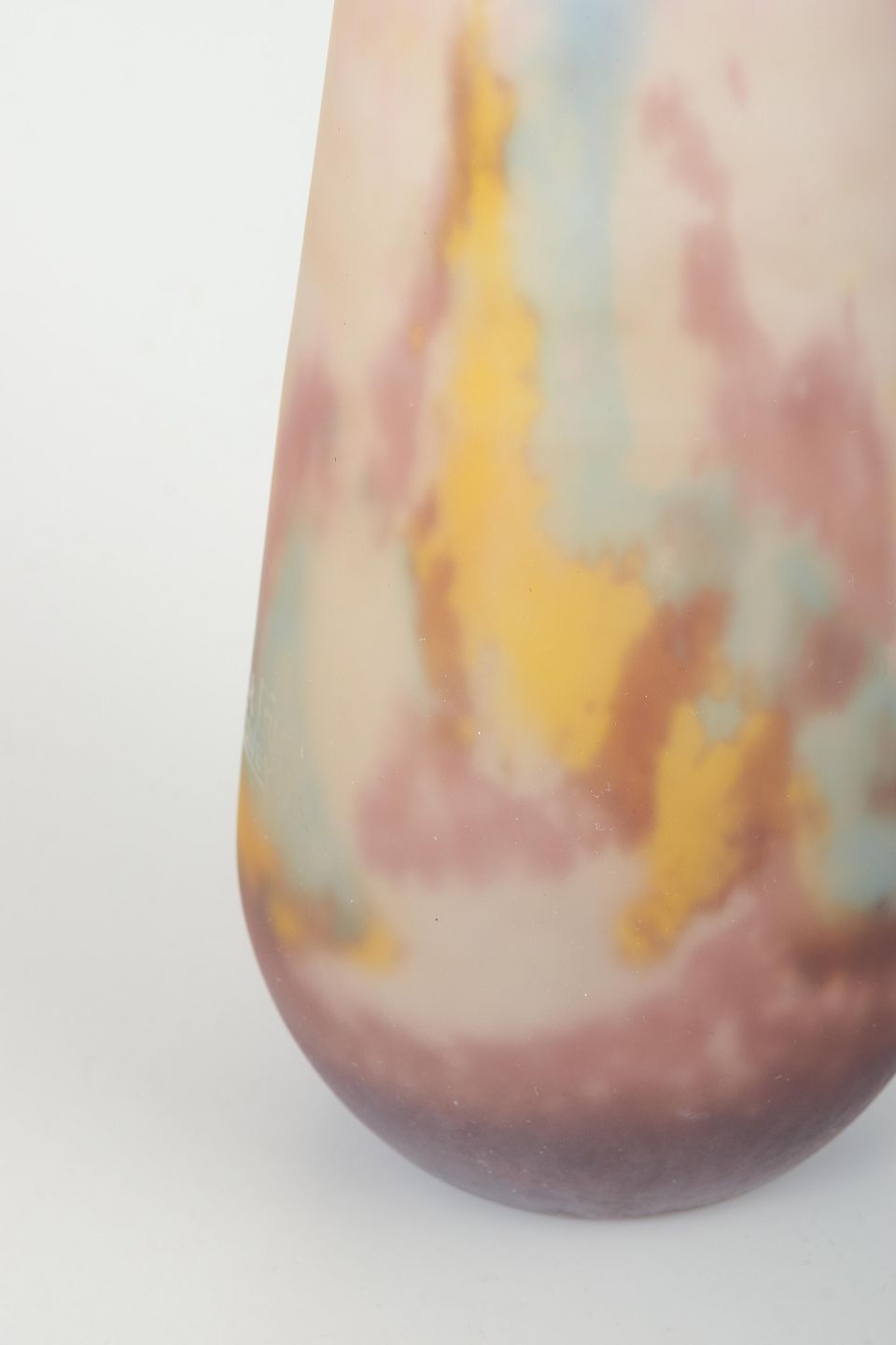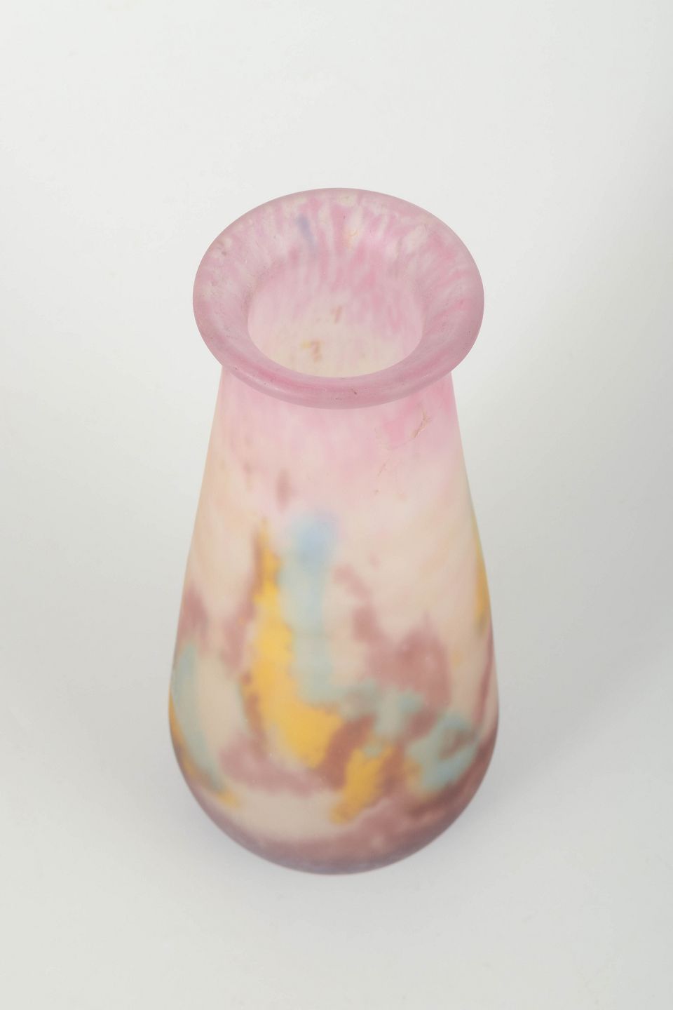 Slank, cylindrisk vase i flerfarvet opaliseret glas med marmoreret dekor i rosa, gule, blå og violette nuancer. Værket viser Muller Frères’ karakteristiske kombination af moderne formsprog og dekorative overflader.