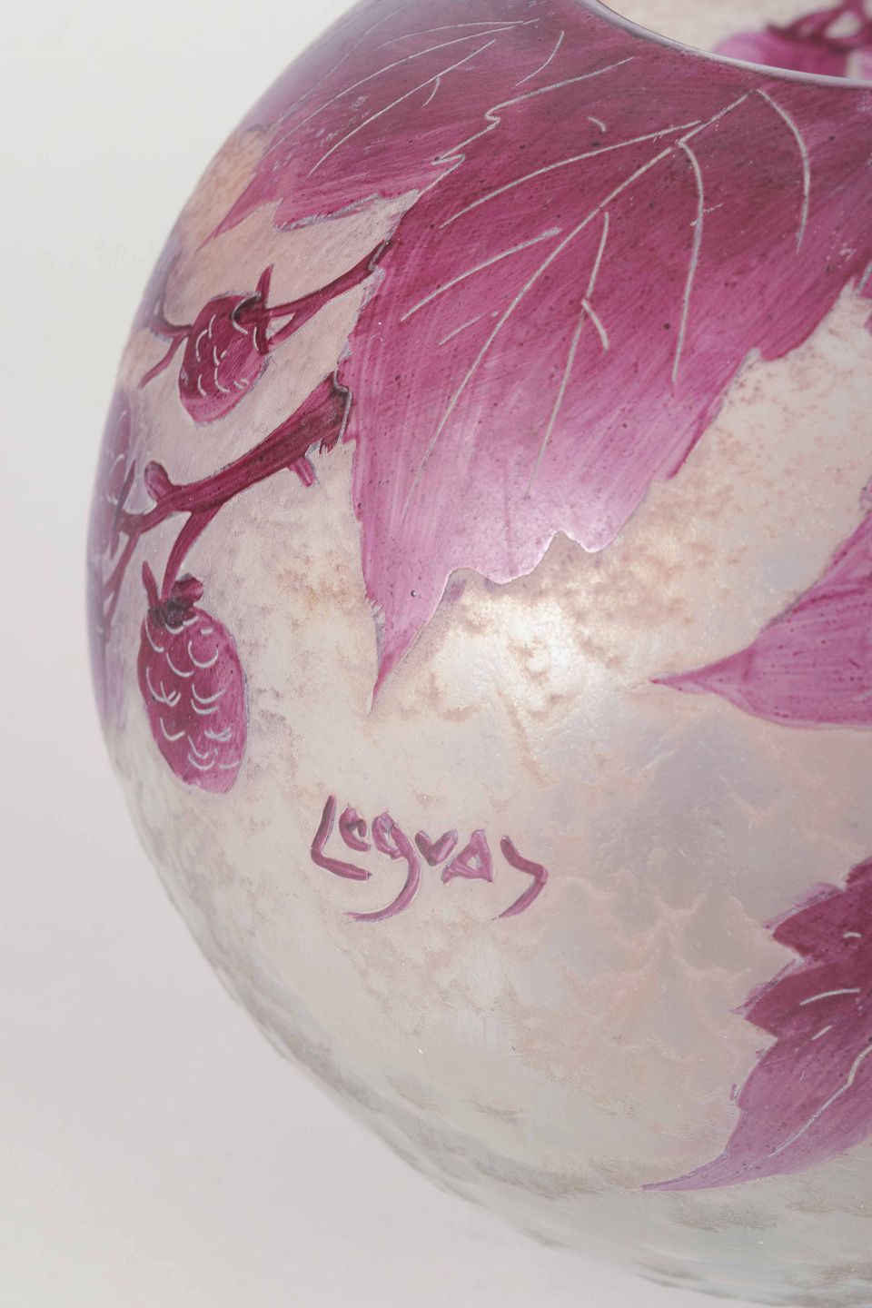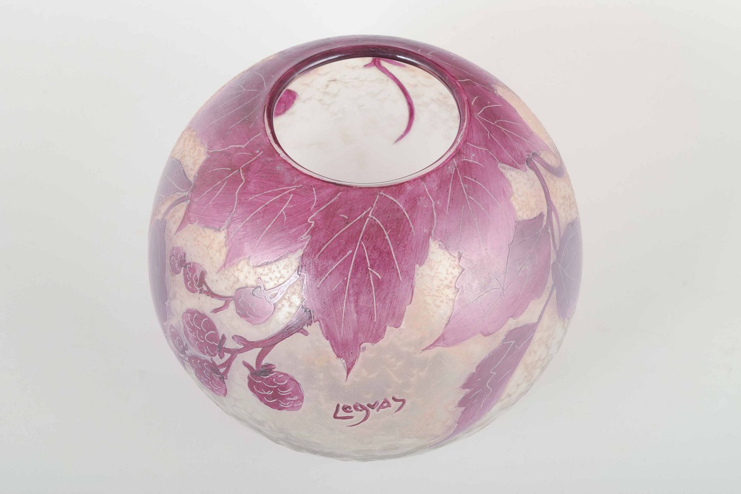 Kugleformet vase i matteret og opaliseret glas med graveret og syreætsede dekorationer af blade og blomster i violette nuancer. Signeret “Légras” i dekoren.