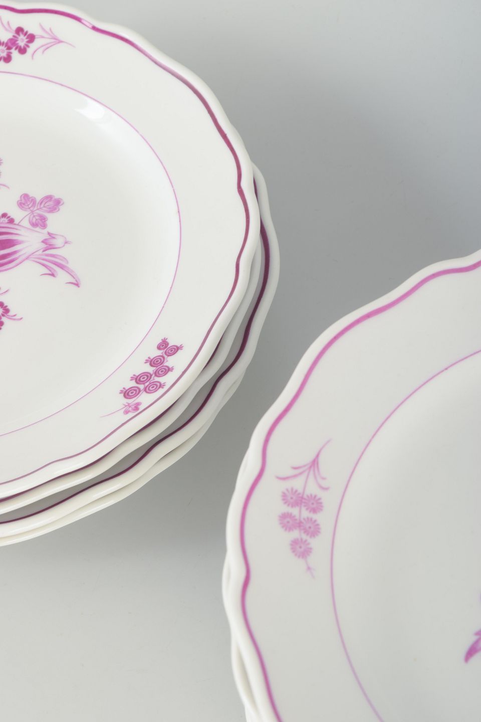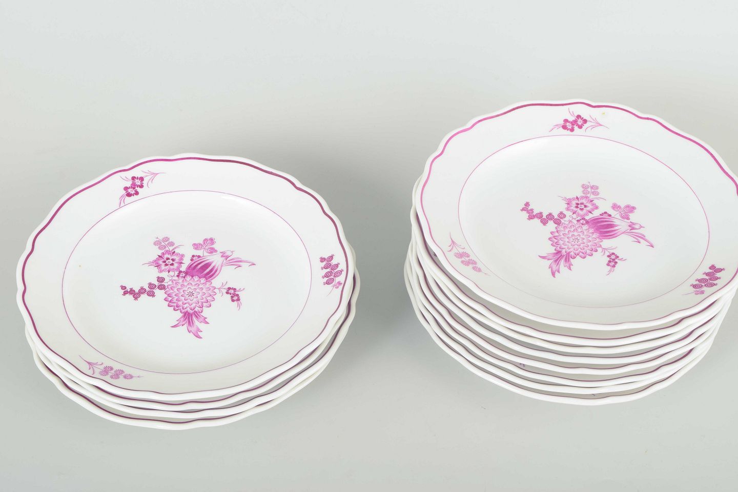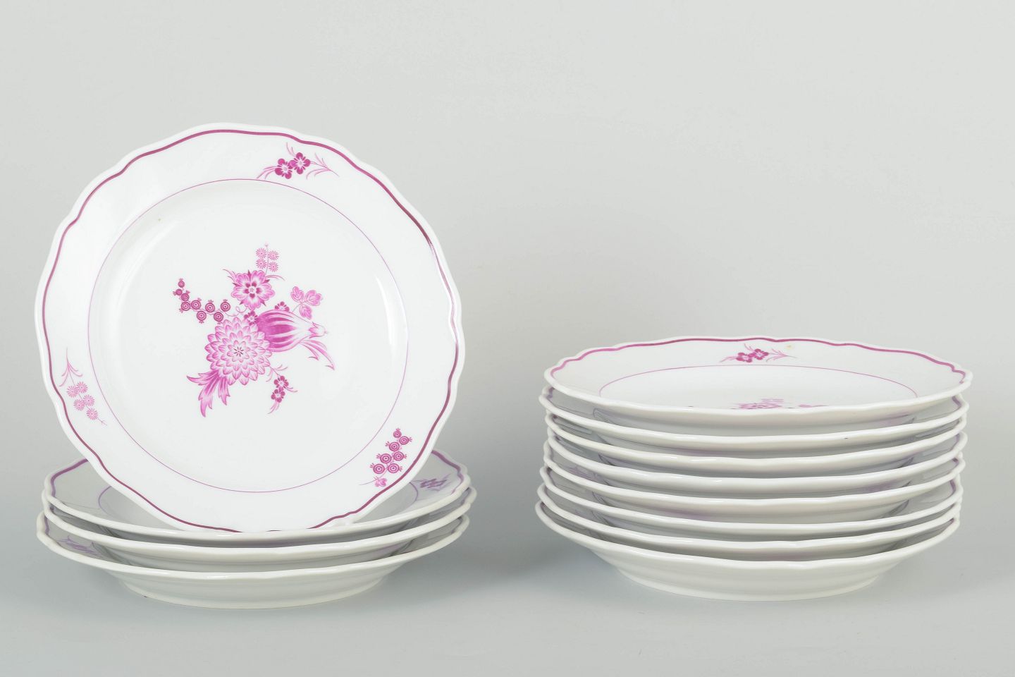 Sæt af tolv dybe tallerkener i porcelæn, håndmalet med dekor i lilla/rosa blomsterkompositioner. Klassiske svungne former med enkel staffering.