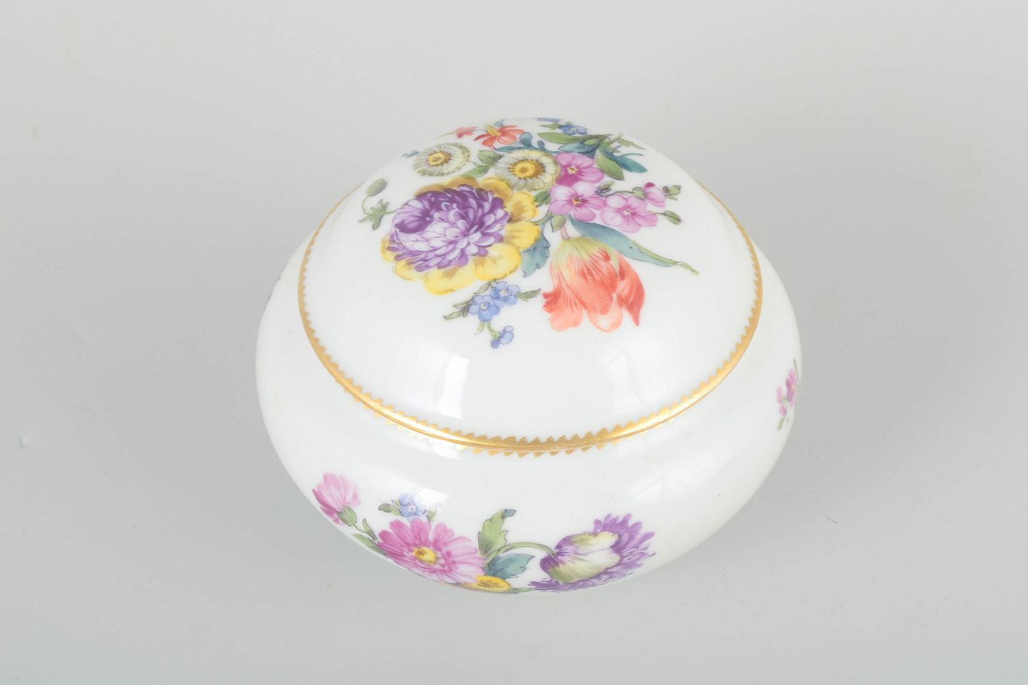 Royal Copenhagen Sachsisk Blomst krukke med låg, ca. 1900.Elegant rund krukke i porcelæn med låg, dekoreret med håndmalede blomster i det klassiske “Sachsisk Blomst” mønster og guldkant.