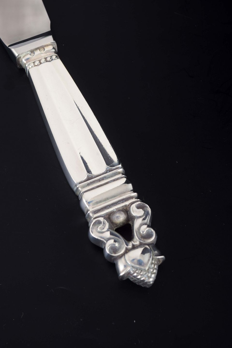 Elegant kagekniv i det klassiske “Konge / Acorn”-mønster, designet af Johan Rohde i 1915. Skaftet er udført i sterling sølv, mens bladet er i rustfrit stål for styrke og funktionalitet.