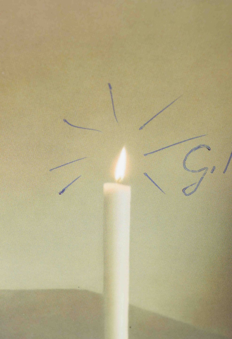 Et ikonisk motiv af Gerhard Richter med et stilleben bestående af et kranium og en lysende stearinlys. Værket fremstår i en poetisk balance mellem liv og forgængelighed, hvor lyset fungerer som symbol på nærvær og eksistens. Dette eksemplar er håndsigneret af kunstneren med dedikation.