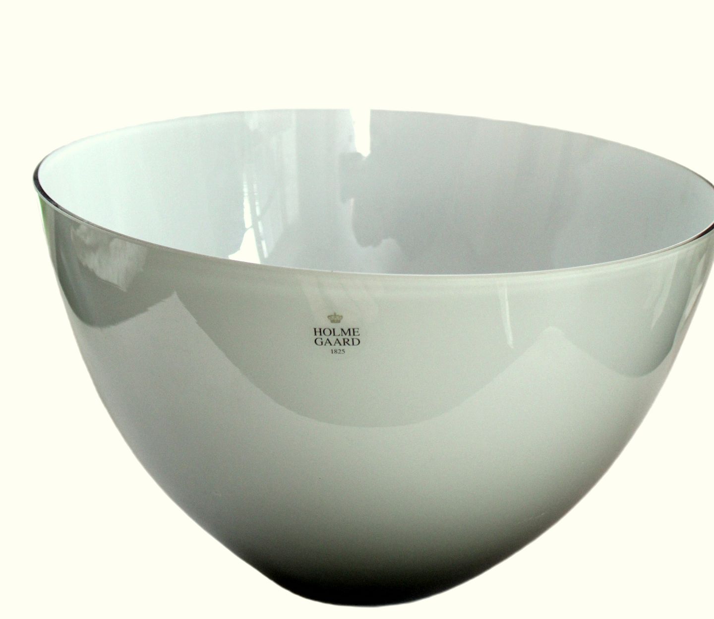 Holmegaard, Cocoon stor skål i udvendig lysegrå farvet glas og hvid indvendig. Designet af Peter Svarrer i 2005. Peter Svarrer starter på Holmegaard i 1997 og er kaldt for lysets mester, manden der bragte Holmegaard ind i det nye millennium efter Michael Bang og Per Lütken. Højde 15,2 cm. Øverste diameter 24,7 cm. Trykt signatur. Pris: 425 kr. stk. Lager: 1