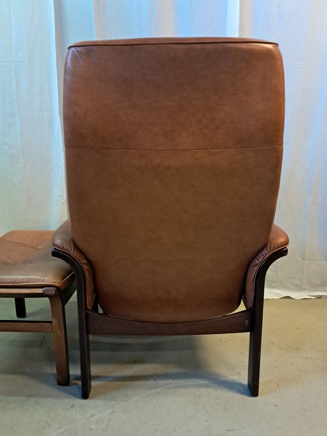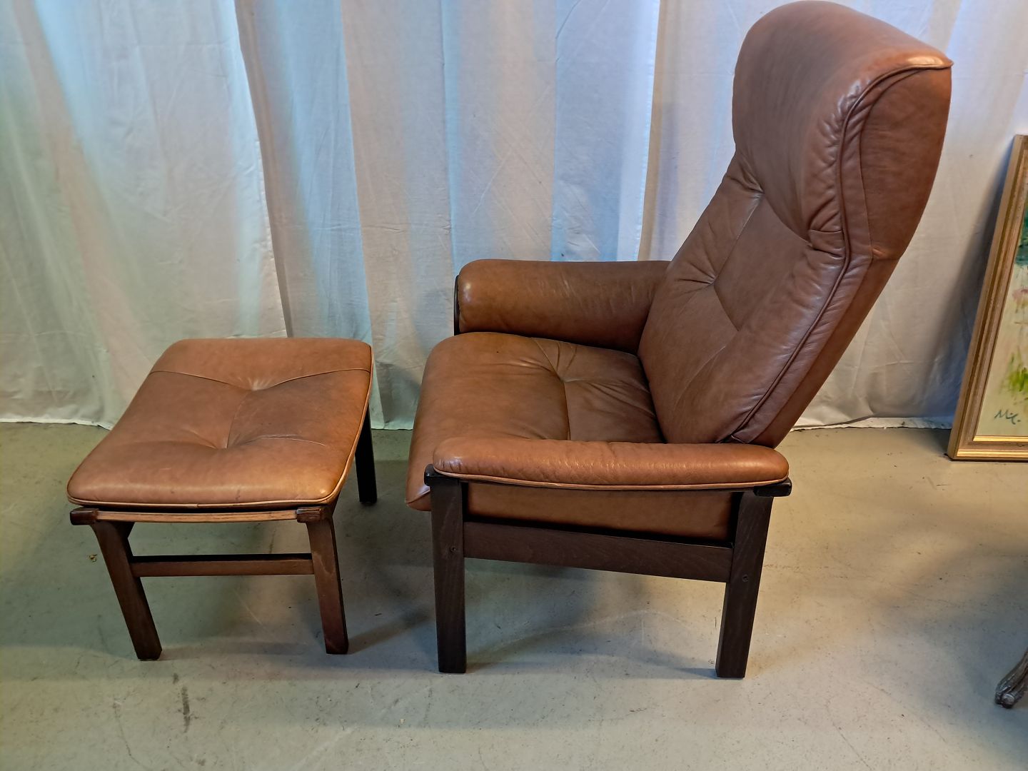 Læder lænestol med skammel, fra 1990erne.Den har brugsspor.
