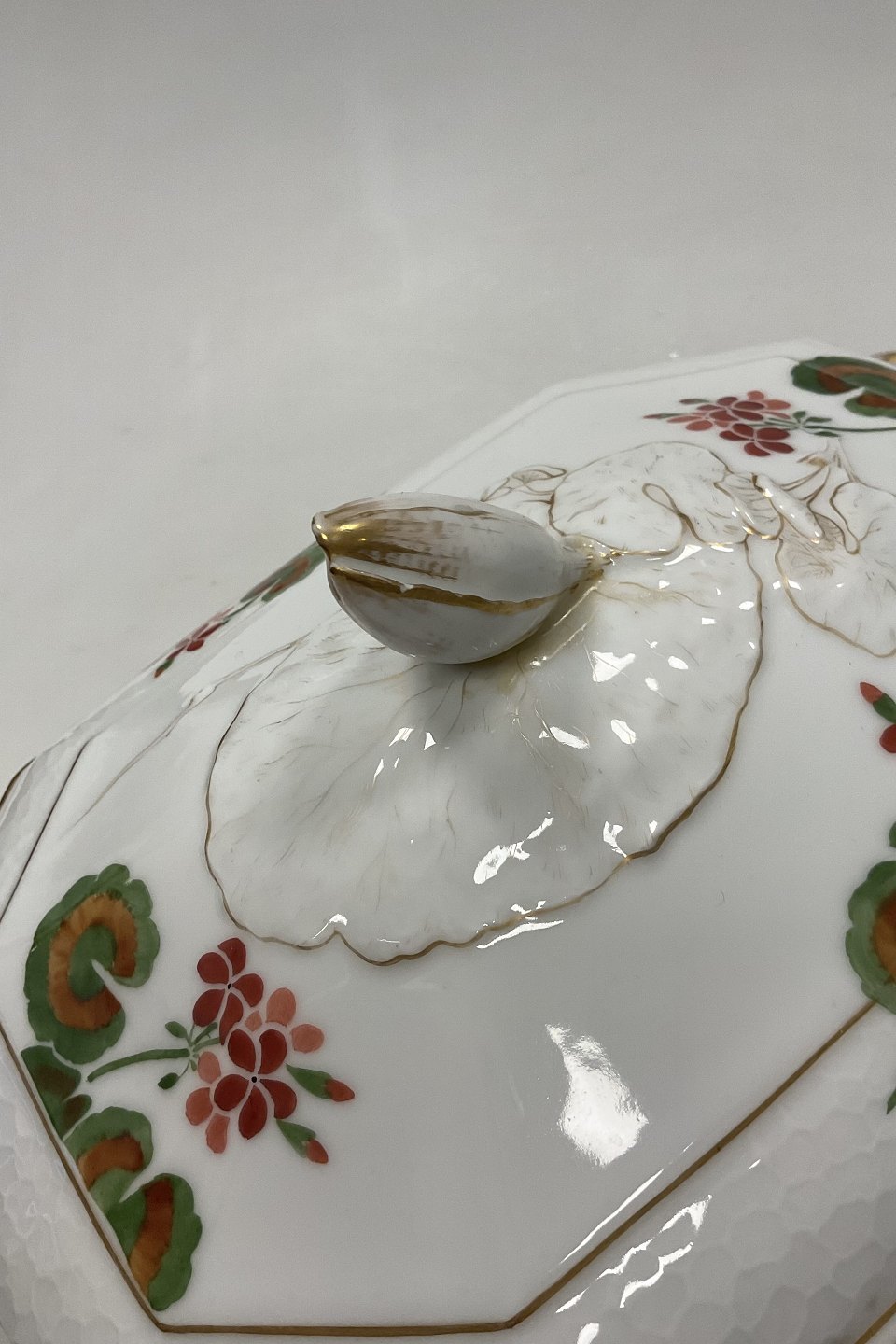 Royal Copenhagen Art Nouveau Stel No. 225 Pelargonie Terrin med fad No. 2038 / 2040Måler 40,5cm x 27,7cm og 27cm x 18cm / 15.94 inch x 10.91 inch og 10.63 inch x 7.09 inch