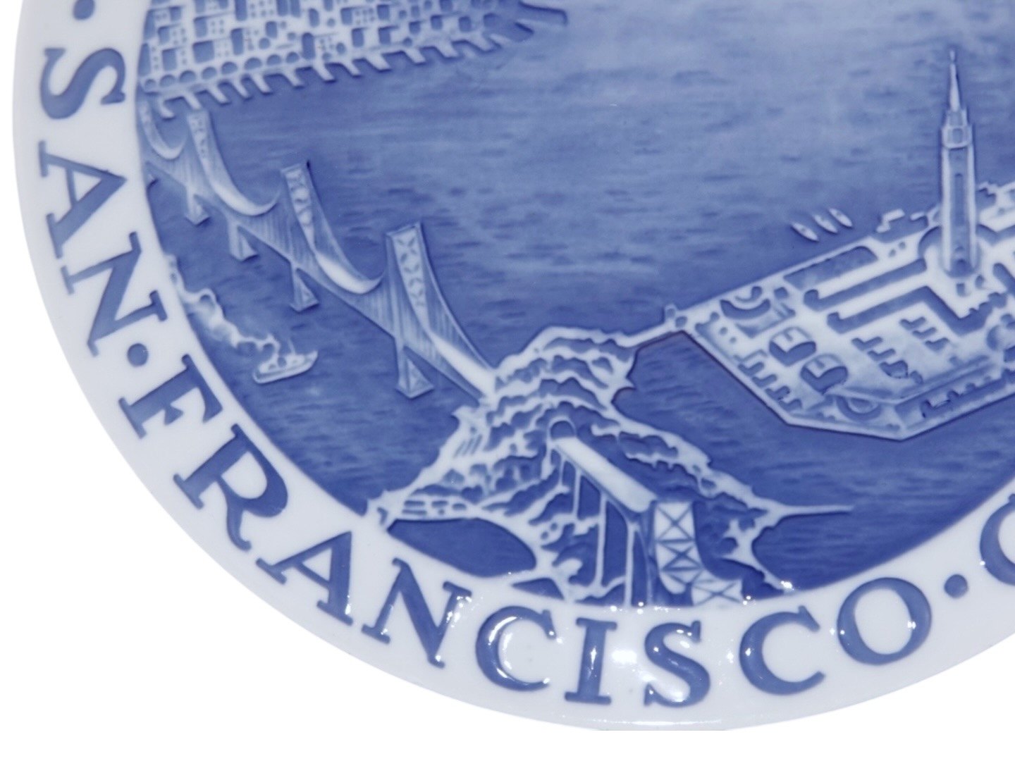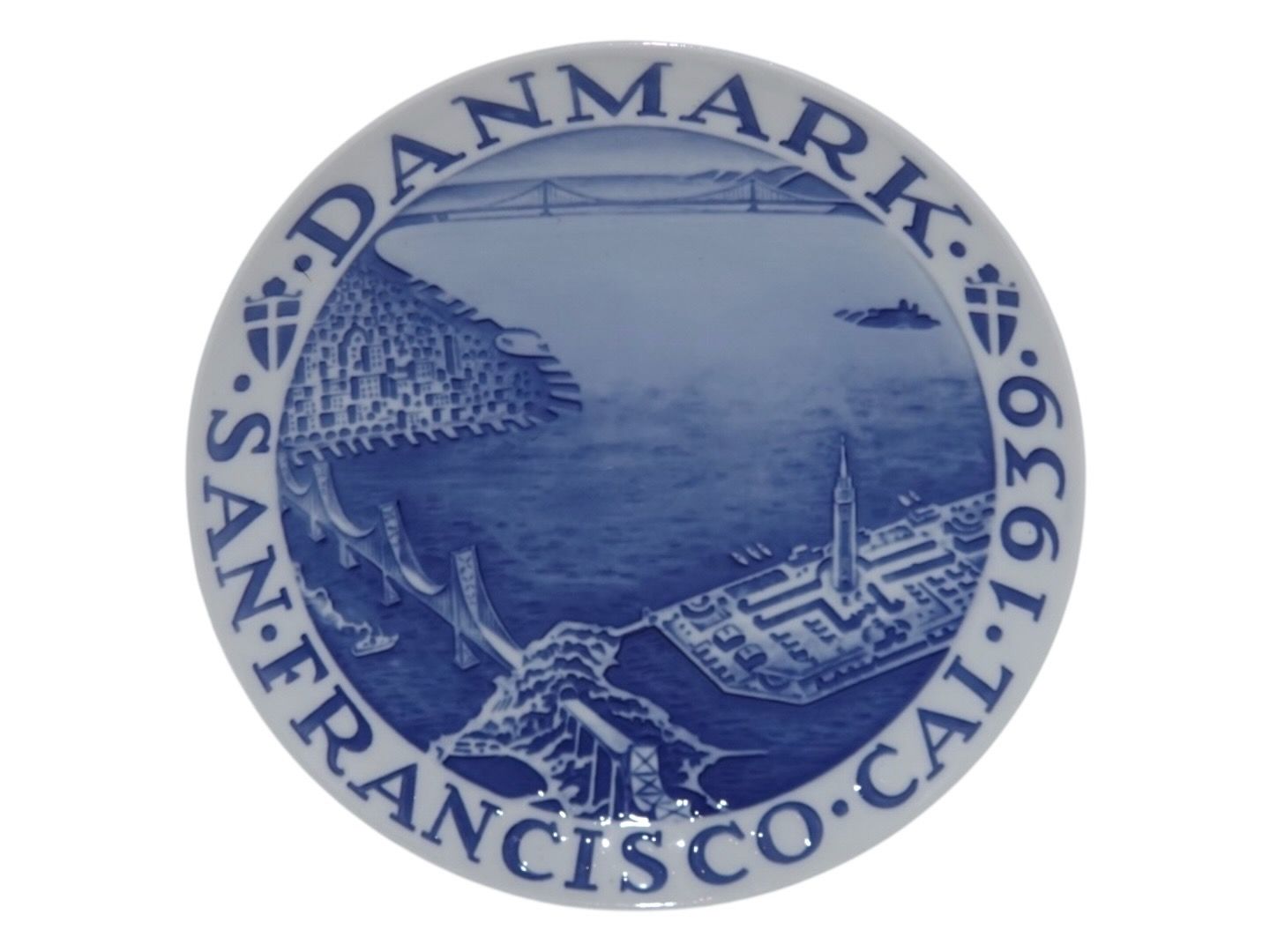 Bing & Grøndahl Mindeplatte fra 1939 med teksten: "Danmark San Fransisco Cal (Californien) 1939".Dekoreret med Golden Gate Bridge og Alcatrax fængsel.